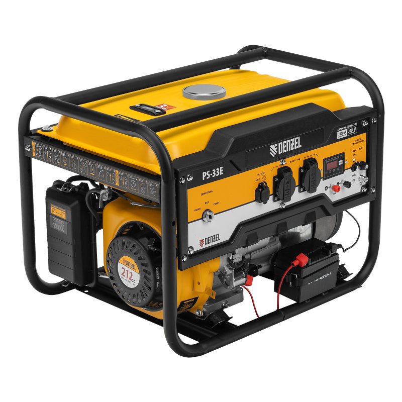 <p>Генератор бензиновый Denzel PS-33E 94537 с электростартером, мощностью 3,3 кВт, напряжением 230 В, с топливным баком объемом 15 л, предназначен для автономного обеспечения бытовой техники и инструментов электрической энергией. Отлично подойдет для использования в загородном доме или для выездных мероприятий в качестве резервного источника питания. Мощный и экономичный двигатель позволяет подключать электроприборы суммарной мощностью до 3,3 кВт, потребляя всего 1,15 литров топлива АИ-92 за 1 час работы.</p><h2>Преимущества</h2><ul><li>Два типа запуска — генератор можно привести в действие как вручную, так и при помощи электростартера ключом зажигания.</li><li>Комплексная защита — система Multi protect не допускает запуск при пониженном уровне масла, предохраняет генератор от перегрузки и короткого замыкания.</li><li>Надежность — альтернатор генератора выполнен с медной обмоткой, распределительный вал изготовлен из прочной стали.</li><li>Автоматическая система стабилизации напряжения — блок AVR позволяет подключать к генератору даже чувствительные к перепадам напряжения электронные приборы и бытовую технику.</li><li>Усиленная рама — генератор можно устанавливать на строительных площадках и часто транспортировать без риска повреждения, также трубы увеличенного диаметра удобны для захвата при погрузке и разгрузке установки.</li><li>Удобное использование — все элементы управления вынесены на переднюю панель.</li><li>Полная готовность к работе — в комплект входят аккумулятор, свечной ключ, 2 вилки 230В/16А и 2 ключа зажигания.</li><li>Подтверждено качество — гарантия от производителя 3 года.</li></ul>