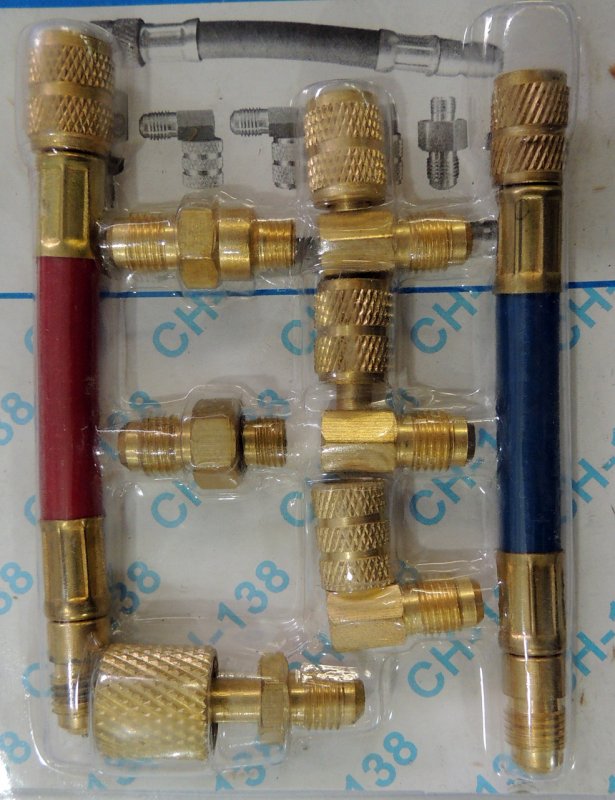 Комплект адаптеров. Адаптеры (переходники) используются для подсоединения к холодильным системам или баллонам с разной резьбой при заправке автокондиционеров. Размеры: 1/4х1/4, 1/4х3/16, 1/4х1/8 под  шланги 1/4х3/16, 1/4х1/8 И два гибких адаптера: 1/4"x3/16" и 1/4"x1/8" Набор переходников предназначен для подключения шлангов заправочной станции к сервисному порту системы кондиционирования автомобилей, в которых используют хладагент R-12.