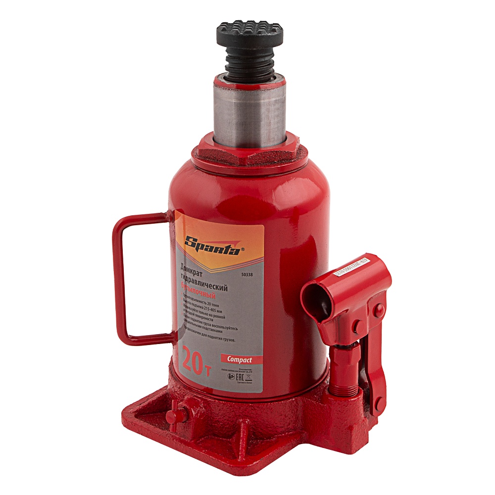 Гидравлический бутылочный домкрат Sparta Compact 50338 предназначен для подъема грузов весом до 20 т на высоту 215-405 мм. Существенно облегчает рабочий процесс, т.к. не требует больших усилий от пользователя. Домкрат будет полезен в автосервисе и гараже для проведения технического обслуживания авто.