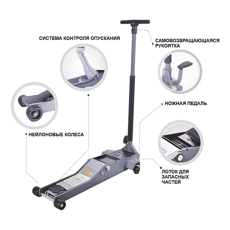 Эргономичная самовозвратная ручка с мягкой отделкой предохраняет автомобиль от повреждений. Ручка Т-образная, что позволяет просто и легко управлять домкратом. Ножная педаль с резиновой накладкой обеспечивает дополнительную безопасность и удобство работы. Удобный лоток для инструмента, запасных частей, гаек и болтов. Бесшумные высокопрочные нейлоновые колеса отличаются высокой маневренностью в условиях ограниченного пространства, не повреждают пол и не ржавеют.