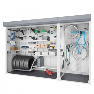 Двухсекционные роллетные шкафы представляют собой сборно-разборную конструкцию, состоящую из набора панелей, соеденительной рамы и двух комплектов рольставней, которые соединяются между собой при помощи винтового соединения с внутренней части шкафа. Рольставни могут иметь различные размеры по ширине, в зависимости от требований. Составные панели выполнены из конструкционной листовой оцинкованной стали ГОСТ 14918 толщиной 1.0мм. Составные элементы окрашены порошковой краской, окраска дополнительно защищает элементы шкафа и придаёт необходимый вид (рольставни стандартно окрашиваются в светло-серый цвет, стандартный цвет RAL 5005, возможность изменения цвета рольставней по запросу). Шкаф предназначен для хранения различных вещей и инструмента, устанавливается в крытых помещениях, паркингах или под навесом на прочную поверхность (бетонная или деревянная поверхность). В шкаф дополнительно можно установить стеллажи, на боковые и заднюю стенки перфорированные панели (для установки нассных удерживающих элементов), различные полки, в нижнюю часть шкафа пол в виде настилов (набор планок). Устанавливаемые рольставни могут быть как стандартные так и усиленные. Параметры стандартных рольставней: Роллетный профиль по стандарту - PD45N. Направляющие шины (толщина стенки 1мм.) по стандарту - GR53х22. Тип управления - пружинно-инерционный механизм (ПИМ) Защитный короб по стандарту - SB45. Запорное устройство - ригельный замок. Параметры усиленных рольставней: Роллетный профиль по стандарту - AER44m/S. Направляющие шины (толщина стенки 2,5мм.) по стандарту - GR53х22. Тип управления - пружинно-инерционный механизм (ПИМ) Защитный короб по стандарту - SB45. Запорное устройство - ригельный замок, 2 ключа.