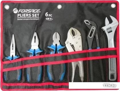Код товара: 25968, Состав: Набор шарнирно-губцевого инструмента 6пр.(бокорезы, плоскогубцы, утконосы, зажим гейферный, пассатижи переставные, ключ разводной), на полотне Forsage F-50614A