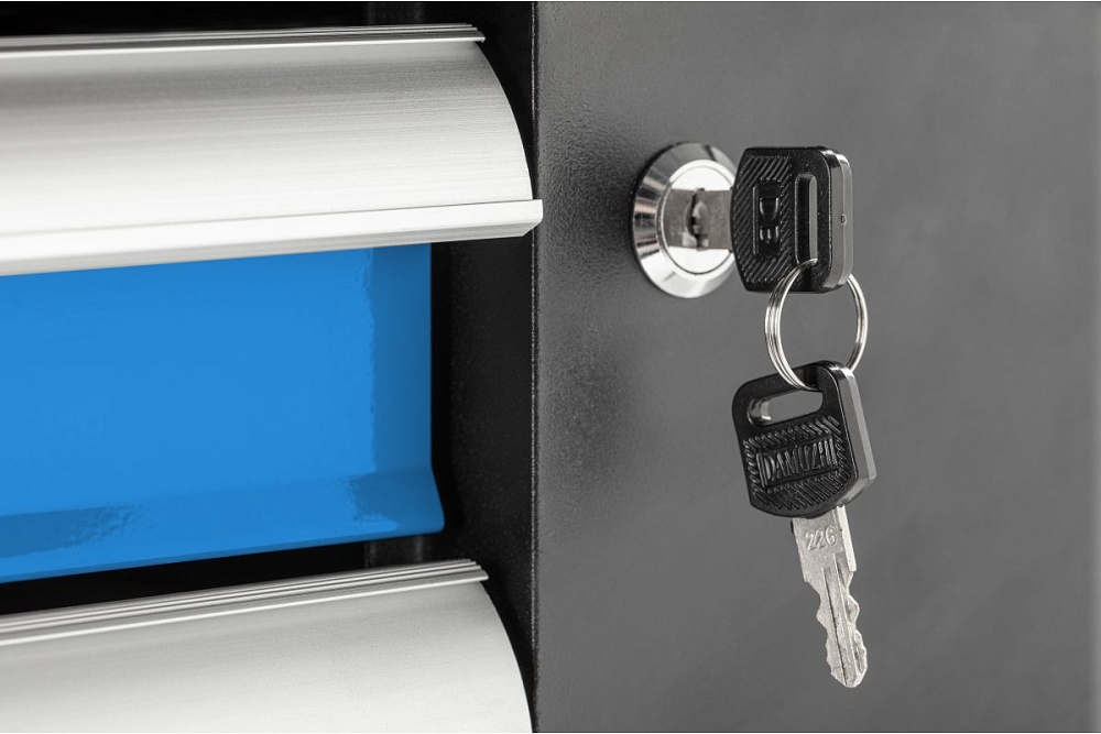 Безопасность: Индивидуальные замки ящиков предотвращают их случайное открытие во время перемещения. Центральный замок с двумя ключами защищает инструменты от кражи.