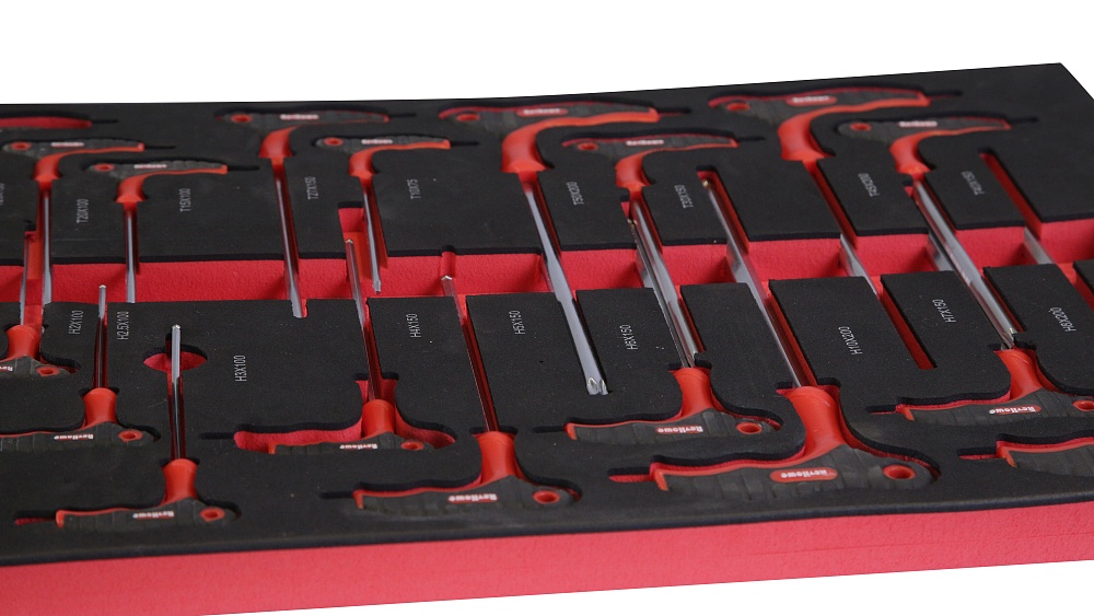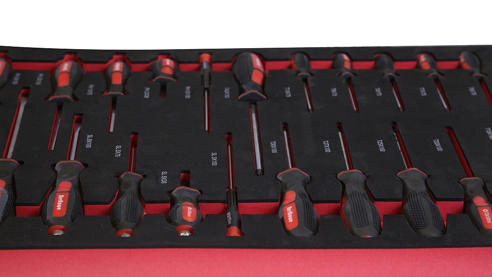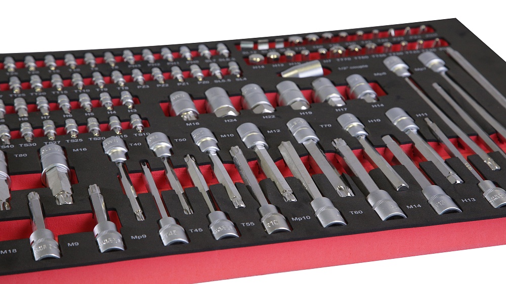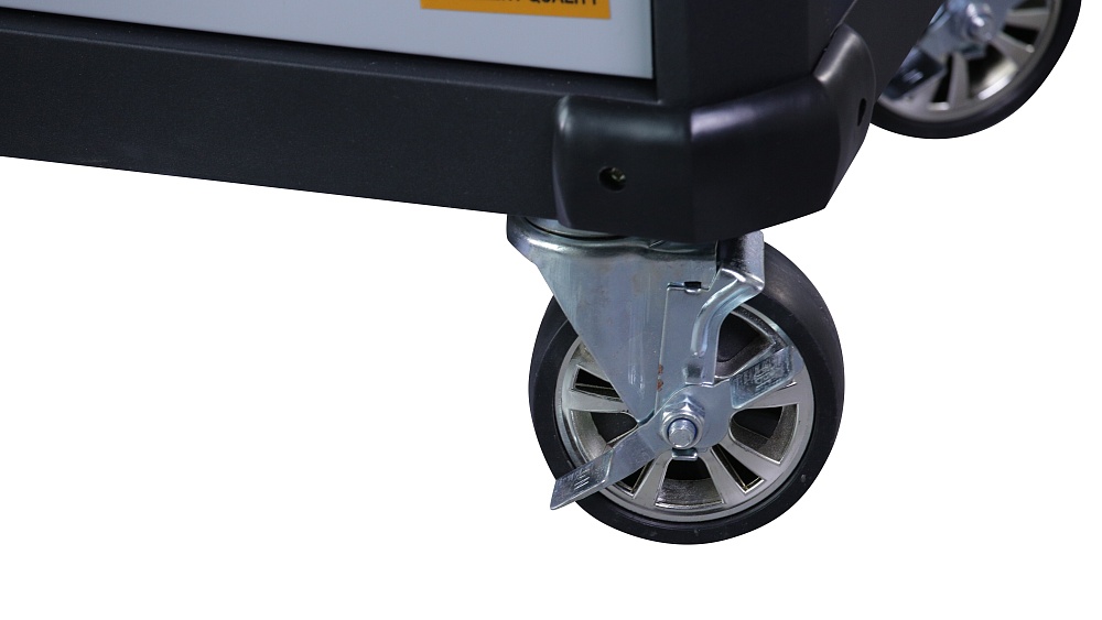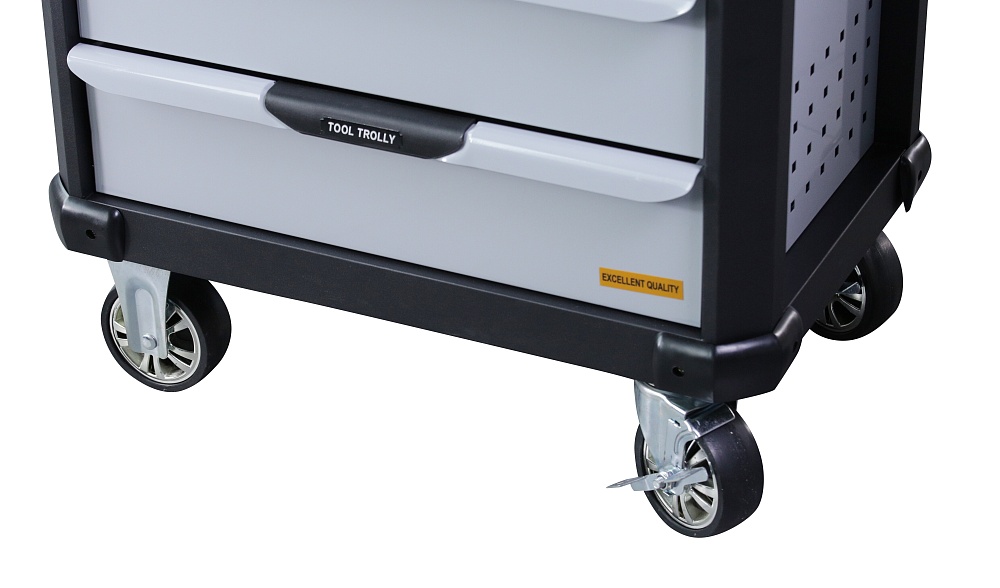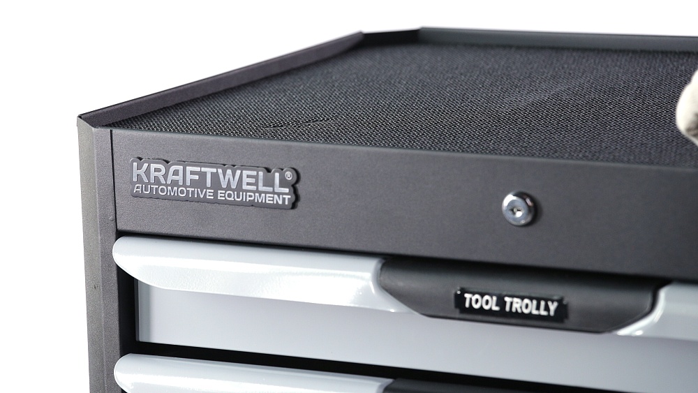 Инструментальная   тележка KRW-TTG оснащена 7-ю выдвижными ящиками.В ПОДАРОК 6 ящиков укомплектованы   ложементами с инструментом (277 предметов). Тележка предназначена для   оборудования рабочих мест в автосервисах, мастерских и других   производственных помещениях. Телескопические направляющие ящиков имеют   механизм фиксации, не позволяющий самопроизвольно открыться ящику, даже если   внутри находится инструмент, а также доводчиком, обеспечивающим плавное   закрытие ящика. Корпус тележки изготовлен из высококачественной стали и   окрашен порошковой краской. Перфорированные боковины предусматривают   установку крючков. Для перемещения тележки предусмотрены обрезиненные   стальные колеса Ф100 мм, одно   из которых имеет стояночный тормоз.