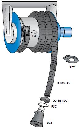 В комплект поставки катушек входит: шланг, резиновое газоприемное сопло с рукояткой, стопор и кронштейн для крепления к стене или потолку рабочего помещения. В комплект поставки катушки с электромеханическим приводом также входит проводной пульт дистанционного управления.