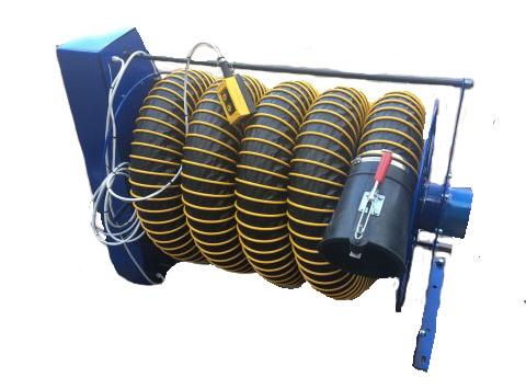 Катушка со шлангом для удаления выхлопных газов (шланг 10,0м. х Ø76 мм)   Механическая пружина возврата шланга. Комплект поставки: шланг из термостойкого армированного эластомера (TPE)., резиновое газоприемное сопло с рукояткой, стопор, салазки для крепления.