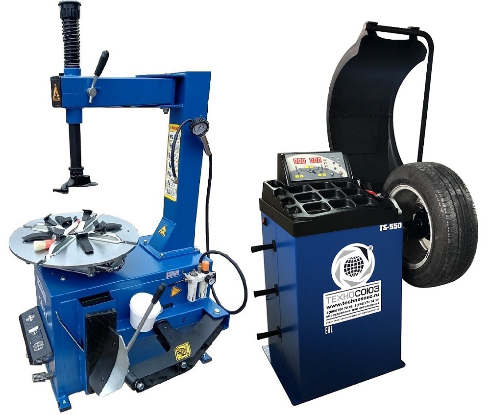Комплект из полуавтоматического шиномонтажного стенда TS-21, для колёс 99% автопарка России. От Матиза до Land Cruiser 200, Спринтеров, Газелей и пр. Для дисков: внешний 11÷19”, внутренний 12÷22”. Большой круглый стол Ø 560мм. В комплекте: пистолет для подкачки шин + монтажка + пластиковые накладки на зажимные кулачки + регулятор давления с влагоотделителем и манометром. Может комплектоваться «третьей рукой» для работы с низким профилем (опция). Очень надёжный шиномонтажный станок, рекомендуем + TS-550 Балансировочный станок (с лазером). В комплекте: кожух с автозапуском + клещи + кронциркуль + быстрозажимная гайка + набор конусов. Автоматический ввод дистанции и диаметра диска. Станок для колес легковых автомобилей, мотоциклов, «Газелей», «Спринтеров» и т.п. Ø покрышки ≤ 760 мм, вес ≤ 65 кг. Размеры диска: ширина 3–9” (76-228 мм) , диаметр диска 10–24” (254-533 мм) Точность ±1гр. 220 В. Режимы работы DINAMIC, STATIC, ALU1, ALU2, ALU3,  ALUS, ST. Автокалибровка. Позволяет производить шиномонтаж и балансировку колес до 24" включительно. <br>