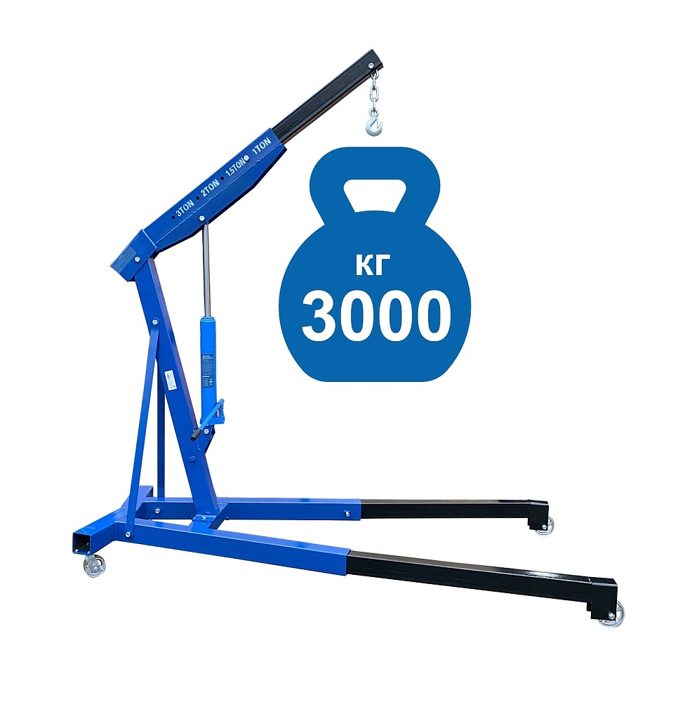 Для профессионального применения. Не складной. Плунжерный насос-быстрый подъем. Для подъема и транспортировки автомобильных узлов, агрегатов и любых других грузов как внутри помещения, так и на улице. Вынос стрелы регулируется в соответствии с максимальной грузоподъемностью крана – 3000 кг. Высота подъёма крана от пола цеха – 0÷2500 мм. Вес: 115 кг.