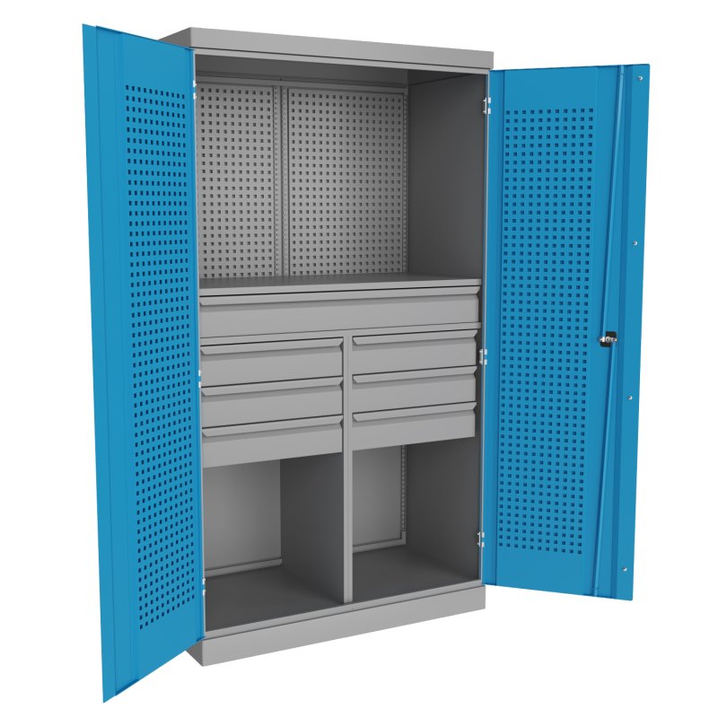 Шкаф инструментальный серии Technic предназначен для хранения оснастки, приспособлений и инструмента на рабочих местах в мастерских, цехах и других производственных зонах. Шкаф изготовлен из листовой стали и обеспечивает надежное запирание дверей ригельной системой.