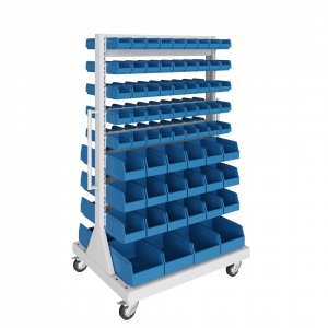 Мобильная кассетница с пластиковыми контейнерами на базе платформы Mobiler. Предназначена для хранения и удобного перемещения на рабочем месте метизов, креплений, запасных частей, оснастки и прочих деталей и приспособлений Система специальных держателей обеспечивает размещение пластиковых контейнеров в 9 ярусов с обеих сторон мобильной стойки. На нижнем ярусе кассетницы размещены 8 контейнеров размером 150х225х350мм На 2, 3 и 4 ярусах размещаются 36 контейнеров размером 130х150х250мм - по 6 контейнеров на одной стороне каждого яруса. Контейнеры устанавливаются на держатели SPD 402 с допустимой нагрузкой до 30 кг. На 5-9 ярусах размещаются 90 контейнеров размером 75х100х165мм - по 9 контейнеров на одной стороне каждого яруса. Контейнеры устанавливаются на держатели SPD 401 с допустимой нагрузкой до 20 кг. Итого в комплектации Mobiler SPK1 - 134 контейнера трех различных типоразмеров. Общая допустимая нагрузка на мобильную кассетницу до 450кг.