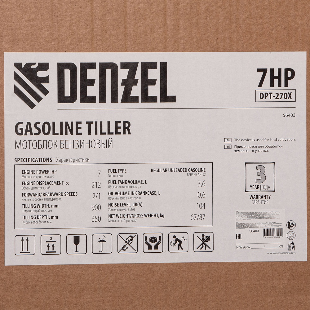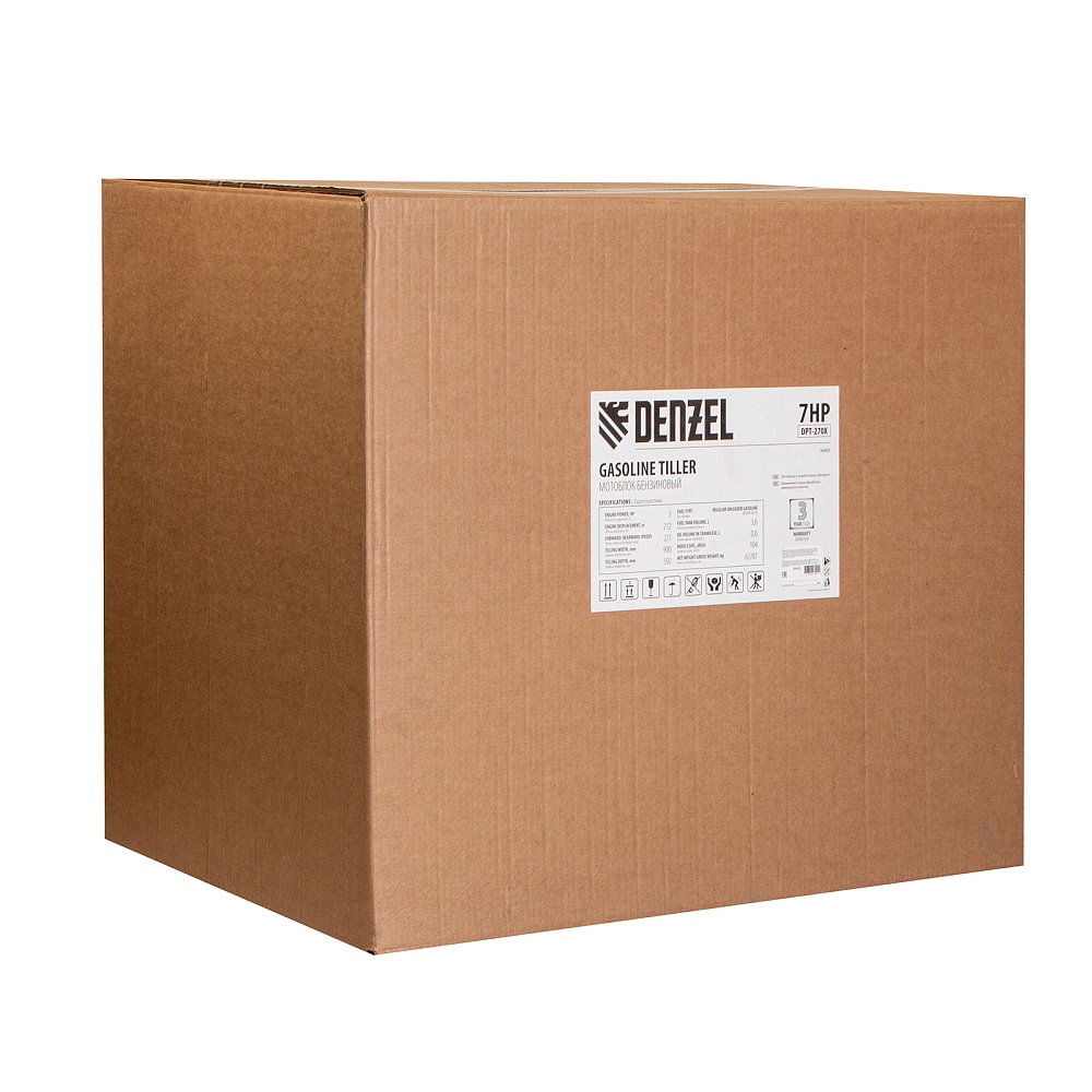 <p>Мотоблок Denzel DPT-270X 56403 идеально подходит для участков площадью свыше 20 соток. Мощный двигатель Denzel серии Long Life на 7 л.с. выдерживает интенсивные нагрузки, поэтому справится с грунтом любой вязкости, даже с глинистой почвой. Благодаря ширине вспахивания 90 см получится обработать поле и целину в короткие сроки, а вес более 60 кг и крупные фрезы с прочным сошником обеспечат глубину обработки до 35 см.,Трехскоростная коробка передач значительно упрощает рабочий процесс. Мотоблок может работать на двух скоростях вперед и на одной — назад. Это позволяет подстраиваться под тип почвы, маневрировать на узкой территории и легко извлекать почвофрезы из земли.</p><h2>Преимущества</h2><ul><li>Многофункциональность — к мотоблоку можно присоединить практически любой тип навесного оборудования — тележку, уборочную технику, косилку, дополнительные фрезы, сажалки и пр.</li><li>Экономичность — двигатель Denzel Long Life позволяет заправлять бак не чаще чем 1 раз в 3,5 часа и реже покупать новое топливо.</li><li>Вал отбора мощности — на мотоблок можно установить даже активное навесное оборудование, и он станет незаменимым помощником на участке.</li><li>Надежные детали — корпус редуктора выполнен из высокопрочного чугуна, не подверженного разрушениям, острые фрезы — из закаленной стали, которую не надо затачивать.</li><li>Высокое качество сборки двигателя — стальной коленвал твердостью 45-50 HRС и распредвал значительно повышают надежность кривошипно-шатунного механизма и обеспечивают стабильную работу даже в зимнее время.</li><li>Система защиты LO-protection — двигатель не запустится, если в картере закончится масло.</li><li>Безопасная работа — благодаря крыловидной планке оператора не отскочит земля и посторонние предметы от вращающихся фрез.</li><li>Комфортное управление — регулятор оборотов мотора и кнопка пуска выведены на рукоятку перед оператором, поэтому можно оперативно менять режим вспашки в зависимости от типа почвы, не наклоняясь.</li><li>Эргономичность — рукоятки укреплены металлической перекладиной, а в месте захвата прорезинены для снижения вибраций.</li><li>Идеальное равновесие — мотоблок отцентрован, поэтому управлять им легче, чем может показаться на первый взгляд.</li><li>Удобное хранение — для устойчивого положения мотоблока предусмотрена складная ножка.</li><li>Легкая заправка — топливный бак имеет большую горловину, что сокращает время на его заполнение и защищает от разбрызгивания бензина.</li><li>Комфортная транспортировка — усиленная рукоятка-бампер позволяет с удобством перемещать и загружать мотоблок в транспорт.</li><li>Отличная проходимость — пневмоколеса увеличенного диаметра обеспечивают маневренность, поэтому мотоблок можно использовать даже на вязком грунте после дождя.</li><li>Расширенная гарантия 3 года — качество мотоблока подтверждено производителем.</li></ul>