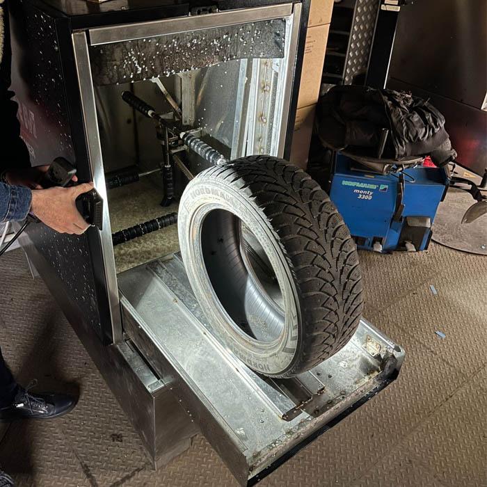 Автоматическая мойка колес гранулами. Диаметр колеса 560 - 850 мм, ширина колеса 135 - 360 мм