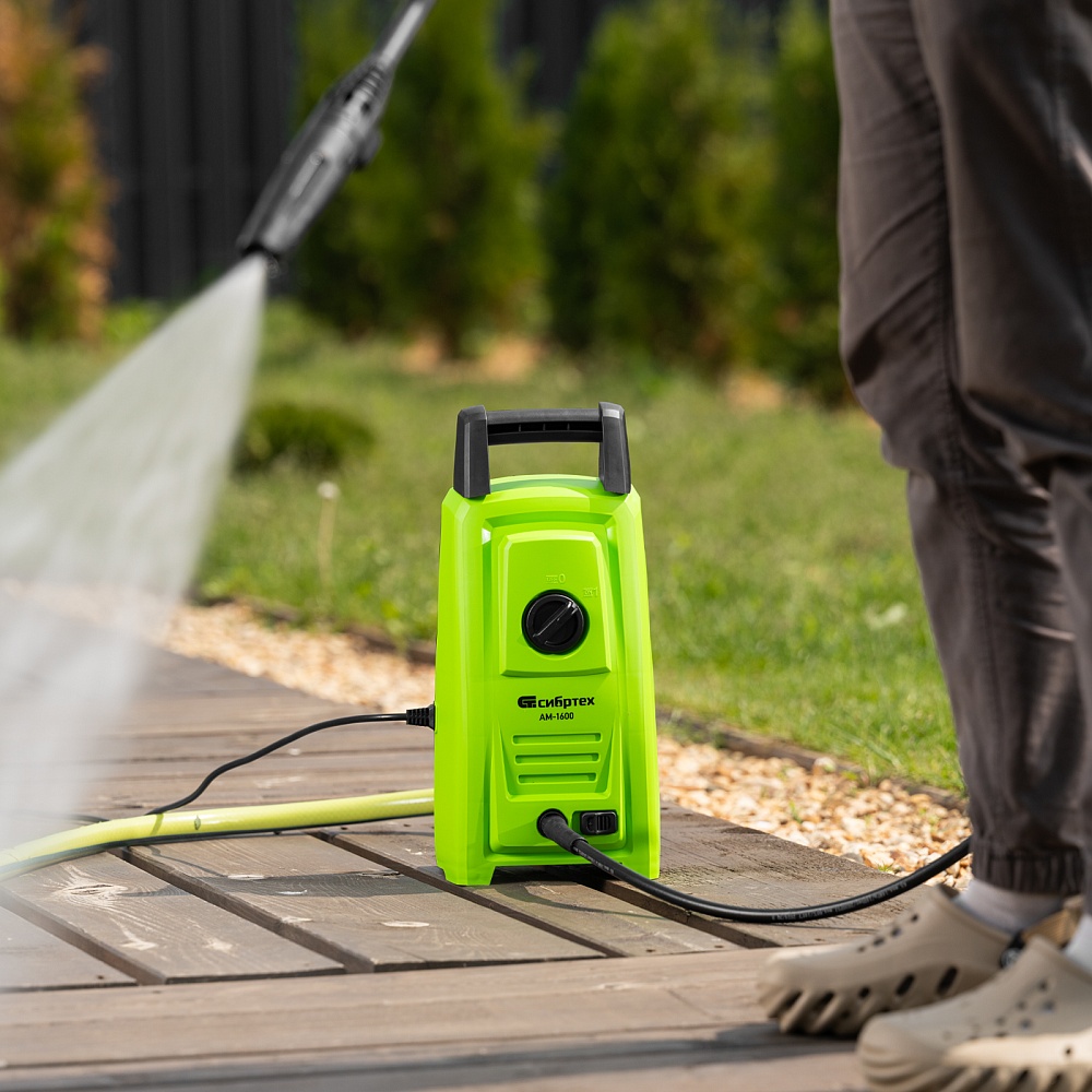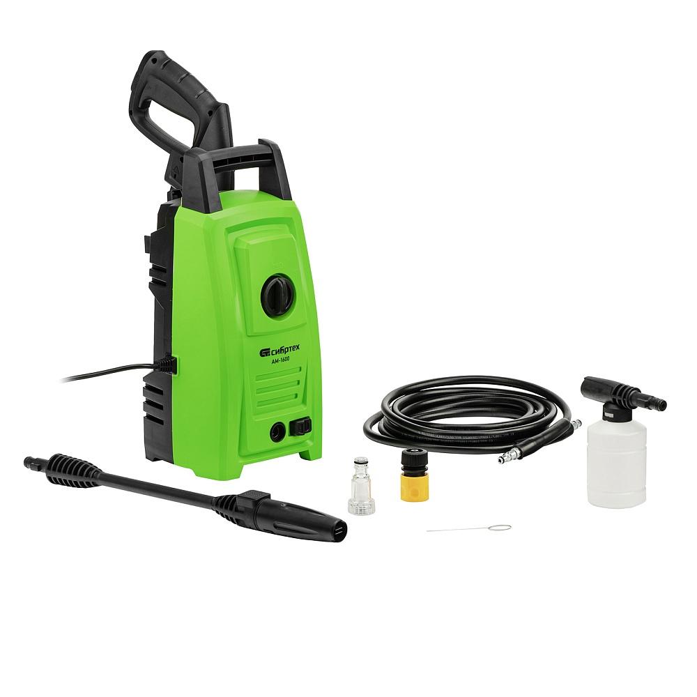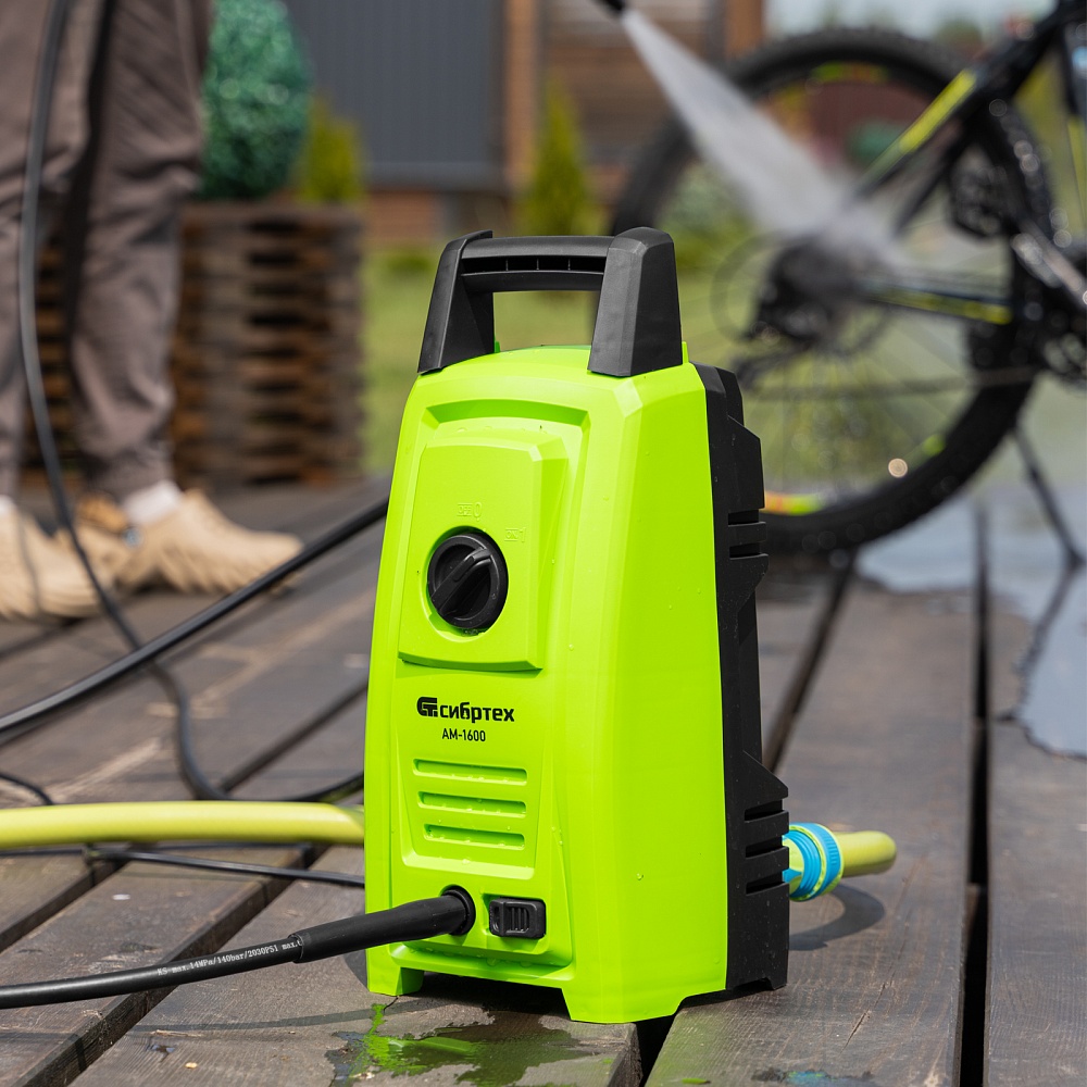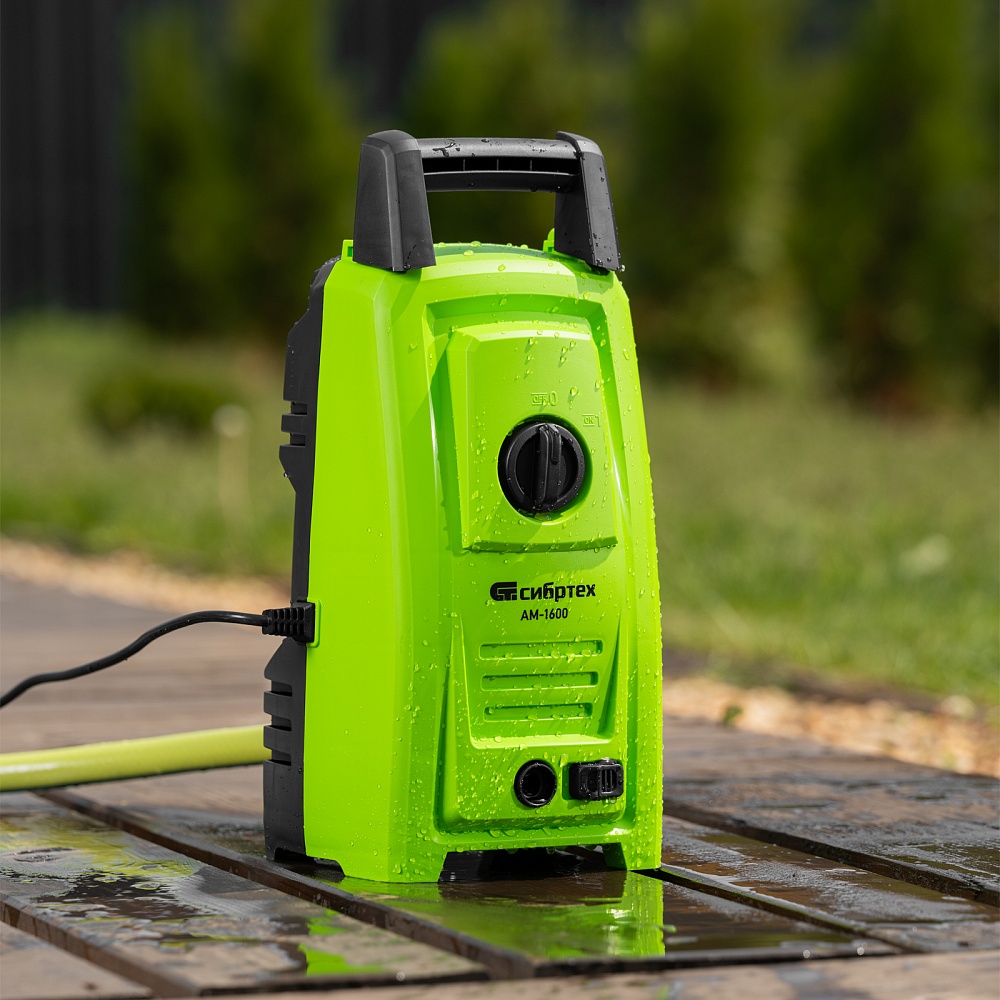 <p>Переносная моечная машина высокого давления Сибртех AM-1600 58224 мощностью 1600 Вт и производительностью 330 л/ч подает струю воды под давлением 130 бар. Позволяет быстро очистить садовые дорожки, забор, стены строений, садовый инвентарь, уличную мебель, кузов автомобиля. Машина подключается к водопроводу, а также способна работать в режиме самовсасывания — в этом случае в качестве источника воды можно использовать любую емкость. Устройство будет полезно владельцам дачных участков.</p><h2>Преимущества</h2><ul><li>Высокий ресурс — алюминиевая помпа выдерживает интенсивное использование.</li><li>Экологичность — во время работы машины отсутствуют вредные выхлопы и неприятный запах.</li><li>Термозащита — в случае перегрева двигатель отключается для предотвращения поломки.</li><li>Электробезопасность — токопроводящие элементы имеют двойную изоляцию.</li><li>Удобная регулировка струи — вращая корпус сопла, можно установить оптимальный вид распыления.</li><li>Эффективное очищение — в комплект поставки входит внешний пеногенератор, позволяющий использовать моющие средства.</li><li>Удобная работа в труднодоступных местах — на пистолет можно установить насадку-удлинитель.</li><li>Безопасность — блокировка рычага пистолета предотвращает случайный запуск.</li><li>Защита от засоров — входной штуцер имеет встроенный фильтр, задерживающий посторонние частицы.</li><li>Легкая подготовка к работе — быстросъемный адаптер позволяет подключить входной шланг одним движением.</li><li>Свободное передвижение по рабочей зоне — длина сетевого кабеля и шланга составляет 5 м, что позволяет реже перемещать мойку во время работы.</li><li>Простое обслуживание — в комплект поставки входит игла для прочистки сопла.</li><li>Продуманное хранение и транспортировка — на корпусе имеется удобная ручка, для кабеля и шланга предусмотрены специальные кронштейны.</li></ul>