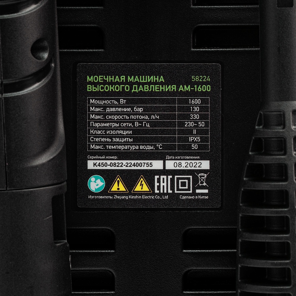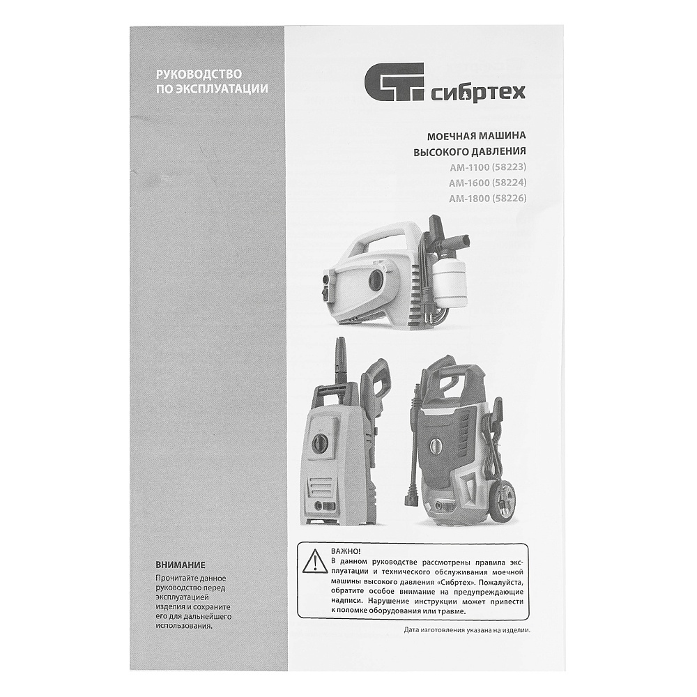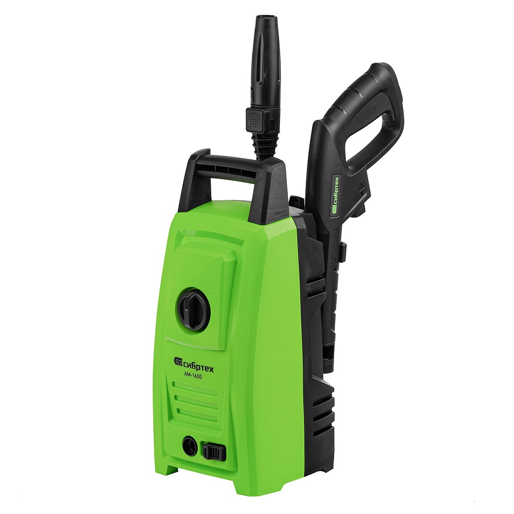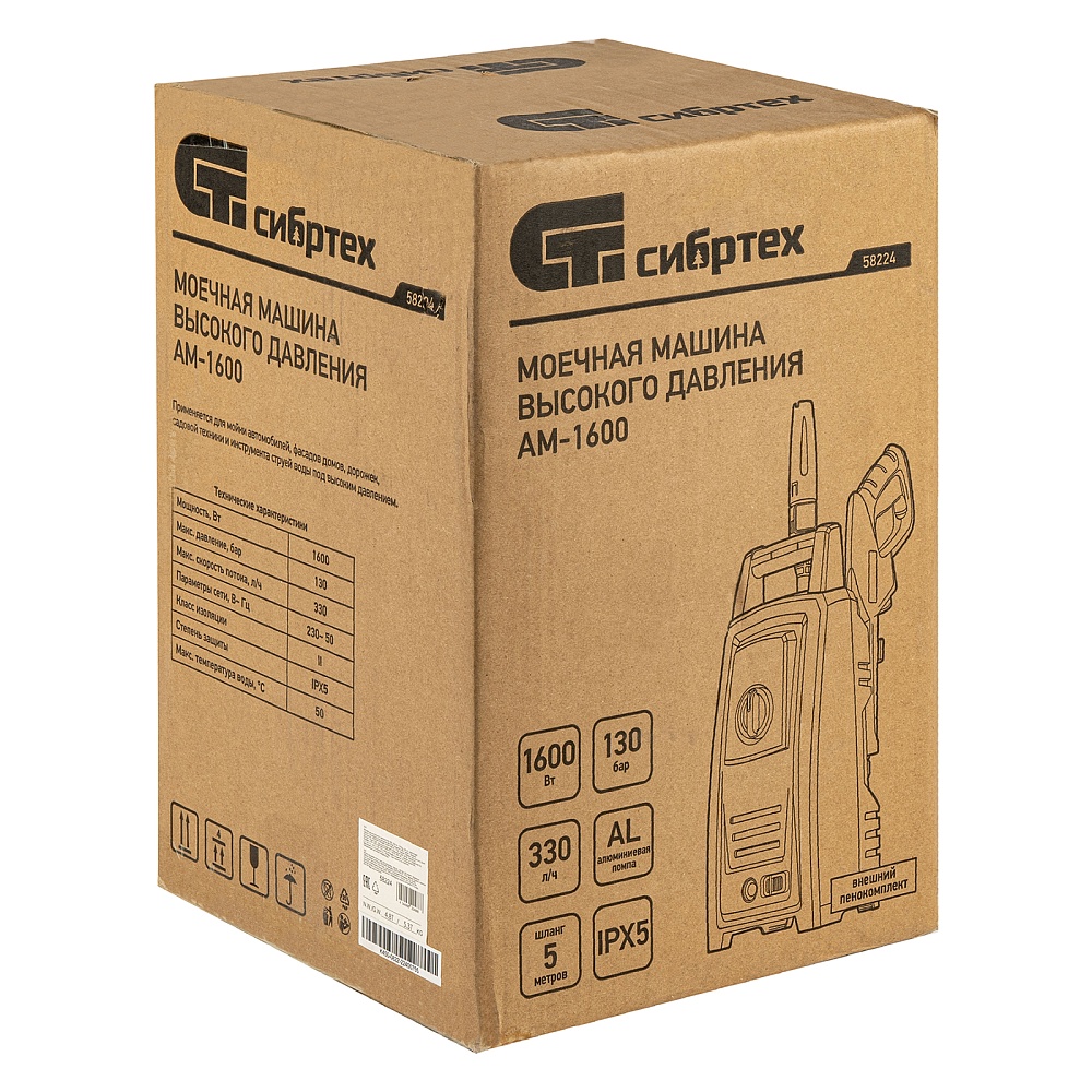 <p>Переносная моечная машина высокого давления Сибртех AM-1600 58224 мощностью 1600 Вт и производительностью 330 л/ч подает струю воды под давлением 130 бар. Позволяет быстро очистить садовые дорожки, забор, стены строений, садовый инвентарь, уличную мебель, кузов автомобиля. Машина подключается к водопроводу, а также способна работать в режиме самовсасывания — в этом случае в качестве источника воды можно использовать любую емкость. Устройство будет полезно владельцам дачных участков.</p><h2>Преимущества</h2><ul><li>Высокий ресурс — алюминиевая помпа выдерживает интенсивное использование.</li><li>Экологичность — во время работы машины отсутствуют вредные выхлопы и неприятный запах.</li><li>Термозащита — в случае перегрева двигатель отключается для предотвращения поломки.</li><li>Электробезопасность — токопроводящие элементы имеют двойную изоляцию.</li><li>Удобная регулировка струи — вращая корпус сопла, можно установить оптимальный вид распыления.</li><li>Эффективное очищение — в комплект поставки входит внешний пеногенератор, позволяющий использовать моющие средства.</li><li>Удобная работа в труднодоступных местах — на пистолет можно установить насадку-удлинитель.</li><li>Безопасность — блокировка рычага пистолета предотвращает случайный запуск.</li><li>Защита от засоров — входной штуцер имеет встроенный фильтр, задерживающий посторонние частицы.</li><li>Легкая подготовка к работе — быстросъемный адаптер позволяет подключить входной шланг одним движением.</li><li>Свободное передвижение по рабочей зоне — длина сетевого кабеля и шланга составляет 5 м, что позволяет реже перемещать мойку во время работы.</li><li>Простое обслуживание — в комплект поставки входит игла для прочистки сопла.</li><li>Продуманное хранение и транспортировка — на корпусе имеется удобная ручка, для кабеля и шланга предусмотрены специальные кронштейны.</li></ul>