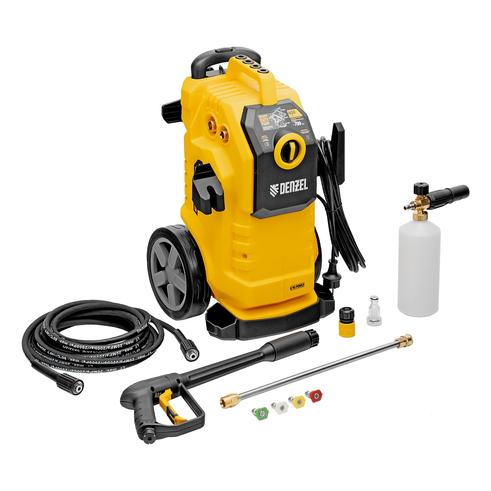 Мойка высокого давления, Шланг высокого давления, Пистолет моечный, Насадка-удлинитель, Форсунки 4 шт., Пеногенератор с бачком для моющего средства, Входной штуцер с фильтром, быстросъемный коннектор шланга, Игла для прочистки сопла, Инструкция по эксплуатации с гарантийным талоном