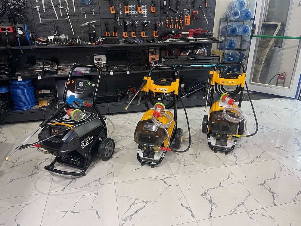 Привод насоса высокого давления - трехфазный (380 В), асинхронный, индукционный электромотор, с частотой вращения 1450 об/мин, мощностью 8,2 кВт и латунной помпой. С данным силовым агрегатом аппарат способен подавать воду под давлением 280 бар и потоком воды 960 л/час. Шланг высокого давления подключается через БРС. Штекер розетки 380в поставляется отдельно.
