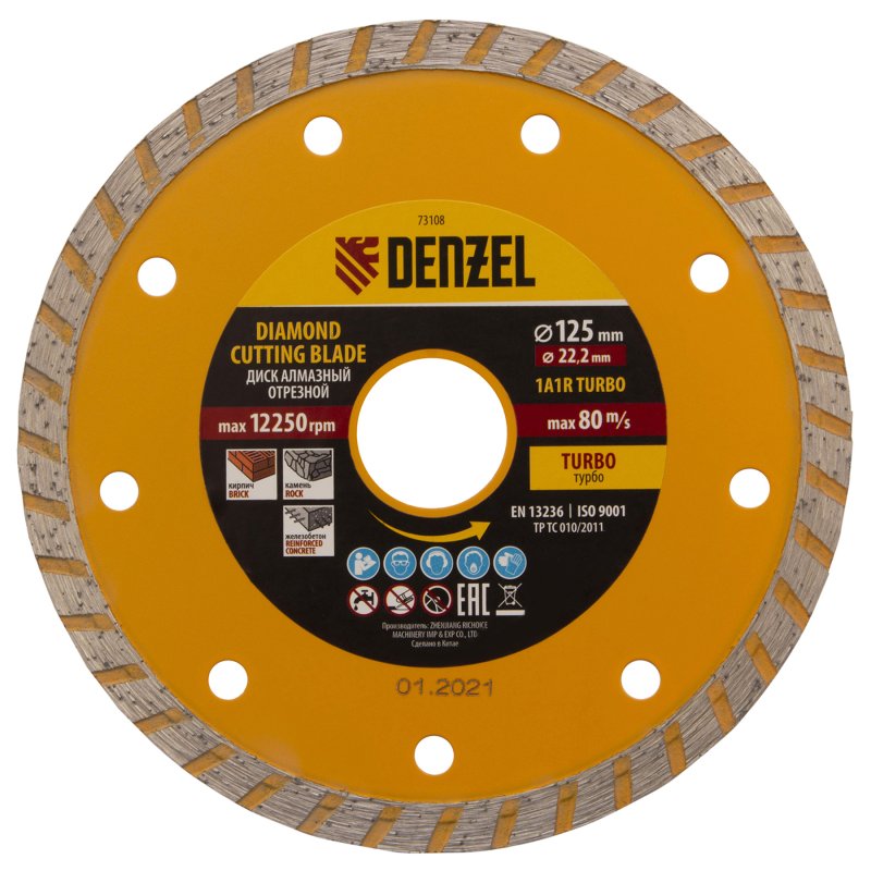 <p>Отрезной алмазный диск Denzel Turbo 73108 диаметром 125 х 22,2 мм используется для сухой резки камня, кирпича, свежего и затвердевшего бетона, железобетона. Благодаря специальной форме испытывает уменьшенную нагрузку при резании материалов. Устанавливается на УШМ и применяется для проведения бытовых и профессиональных отрезных работ.</p><h2>Преимущества</h2><ul><li>Высокая скорость реза — рабочая часть шириной 7 мм отличается плотной концентрацией алмазов.</li><li>Удобное применение — водяное охлаждение не требуется.</li><li>Надежность — рабочая часть, изготовленная по технологии холодного прессования, выдерживает высокие нагрузки.</li><li>Максимальная эффективность — турбированный диск справляется даже с резкой армированного бетона.</li></ul>