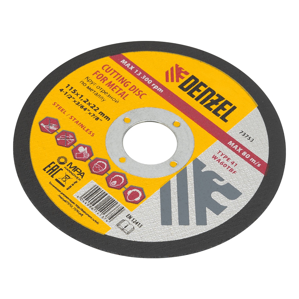 <p>Отрезной круг по металлу Denzel WA60TBF 73753 размером 115 х 1,2 х 22,2 мм рассчитан на интенсивную работу с УШМ. Подходит для резки углеродистой и нержавеющей легированной стали. Круг можно использовать не только в быту, но и для решения профессиональных задач.</p><h2>Преимущества</h2><ul><li>Эффективность — абразив из белого электрокорунда со специальными добавками быстро режет сталь, в т.ч. нержавеющую, и не перегревается, в отличие от оксида алюминия.</li><li>Аккуратная работа — благодаря толщине 1,2 мм и средней по плотности структуре круг обеспечивает ровный и чистый рез.</li><li>Надежность — оптимально подобранная теплостойкая бакелитовая связка с упрочняющими элементами крепко удерживает абразив.</li><li>Безопасная работа — усиленная стеклосетка увеличивает прочность круга на разрыв, предотвращая его разрушение при высоких нагрузках.</li><li>Высокое качество — круг прошел строгий технологический контроль на каждом этапе производства.</li></ul>