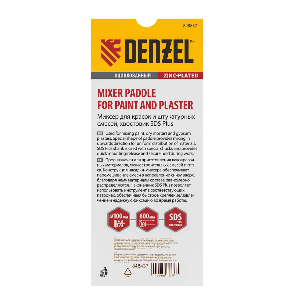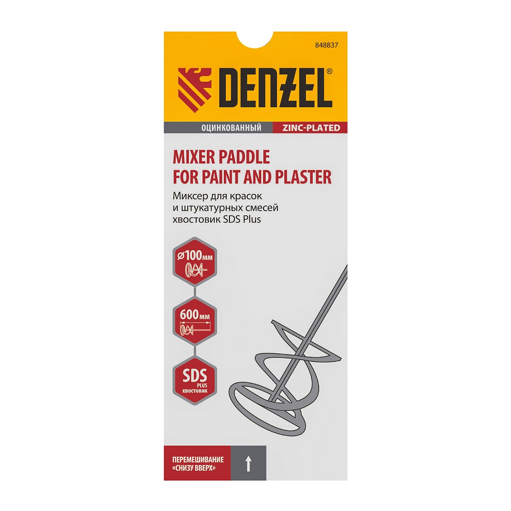 <p>Оцинкованный миксер для красок и штукатурных смесей Denzel 848437 длиной 400 мм, с шестигранным хвостовиком 8 мм, имеет венчик диаметром 60 мм и используется для приготовления строительных растворов. Насадка перемешивает состав снизу вверх, что позволяет добиться полной однородности готовой смеси. Защитное кольцо предотвращает повреждение емкости, в которой готовится раствор. Миксер пригодится во время строительства и ремонта.</p><h2>Преимущества</h2><ul><li>Деформационная стойкость — прочная сварная конструкция выдерживает активное использование.</li><li>Долговечность — оцинкованная поверхность миксера устойчива к механическим повреждениям и образованию коррозии.</li><li>Надежная фиксация в зажимном патроне — насадка подходит для установки на дрели и миксеры средней и высокой мощности.</li></ul>