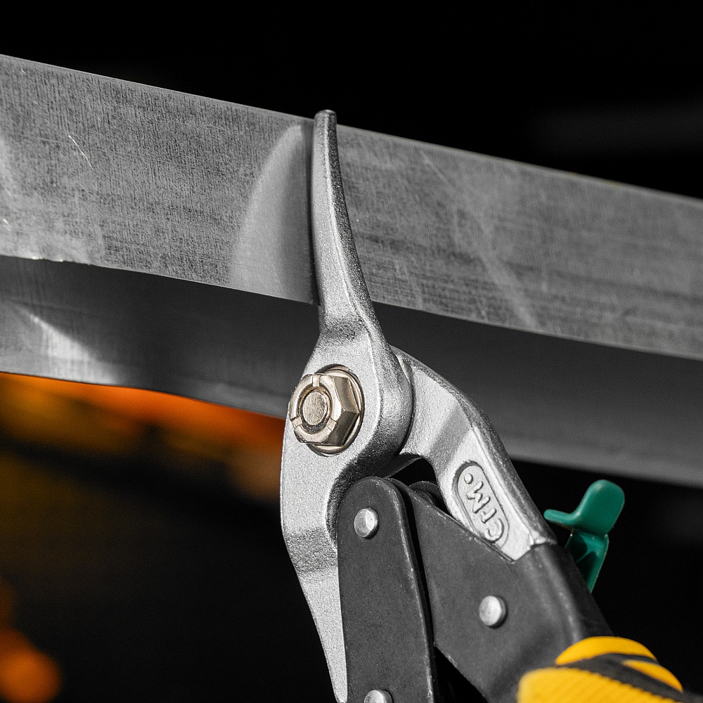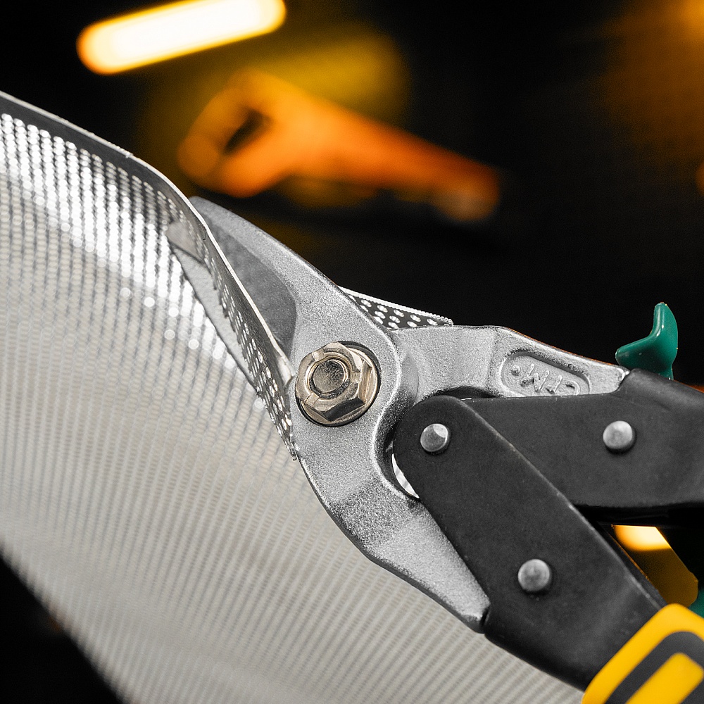<p>Ножницы по металлу Denzel 78371 общей длиной 270 мм, из стали-CrMo, с трехкомпонентными рукоятками, предназначены для прямого и правого реза листовых металлических заготовок и металлопрофиля толщиной до 1,2 мм. Инструмент с усиленной конструкцией осевого шарнира рассчитан на профессиональное использование. Ножницы используются для проведения строительных, кровельных и слесарных работ.</p><h2>Преимущества</h2><ul><li>Высокое качество исполнения — ножницы изготовлены из прочной хромомолибденовой стали методом горячей штамповки, остро заточенные кованые лезвия с насечками не соскальзывают с заготовок.</li><li>Эффективность — режущие кромки закалены до твердости 60-62 HRC и легко справляются даже с прочной «нержавейкой».</li><li>Безопасность — блокировочный замок предотвращает случайное раскрытие лезвий во время транспортировки и хранения.</li><li>Комфортная работа — плоский соединительный винт не цепляется за заготовки, удлиненные трехкомпонентные рукоятки не выскальзывают из руки.</li><li>Удобное хранение — на рукоятке имеется проушина для подвешивания на крючок или гвоздь.</li></ul>
