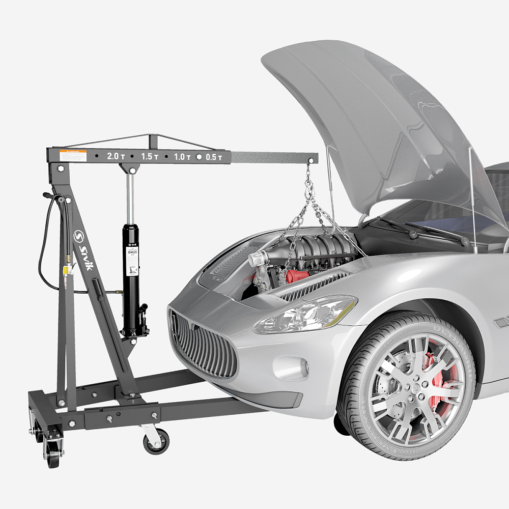 • Регулируемая по углу наклона стрела крана позволяет извлекать двигатель и другие агрегаты автомобиля без особых усилий