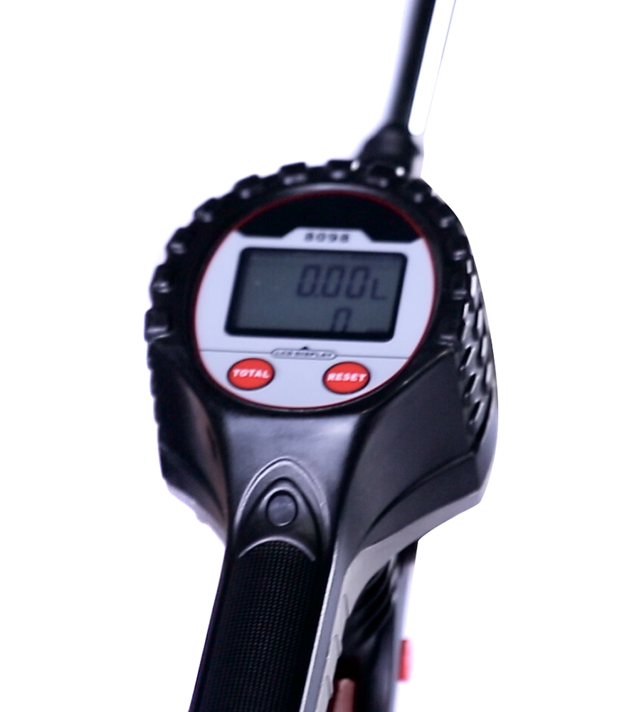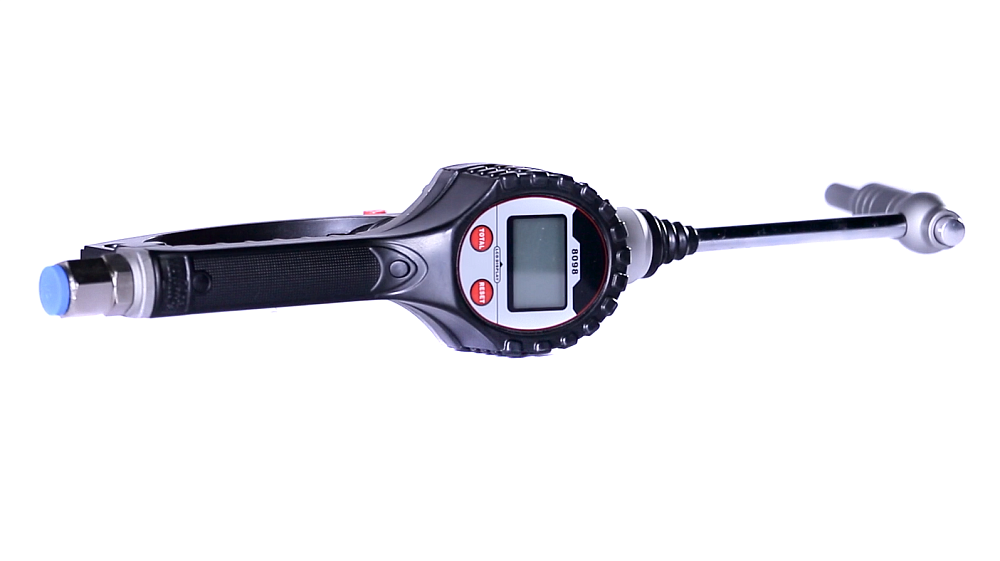 Пистолет для раздачи масла с электронным расходомером и цифровым дисплеем применяется в системах раздачи масла и позволяет с высокой точностью контролировать расход масла. Цифровой дисплей отображает текущий расход и благодаря ему оператор в нужный момент прекращает подачу масла, а также общий расход масла за определенный период времени. В случае намеренного или случайного прерывания процесса раздачи путем отпускания курка пистолета, значение текущего расхода не сбрасывается и после повторного нажатия на курок, отсчет продолжится с того же места. Для сброса значения текущего расхода, на корпусе пистолета предусмотрена кнопка «Reset». Для просмотра общего расхода необходимо нажать на кнопку «Total». Данный тип пистолетов чаще всего используется в системах централизованной раздачи масла и в составе комплектов для раздачи масла из бочек объёмом 200 литров, состоящих из пневматического насоса, шланга и, в некоторых случаях, тележки. При желании, такой комплект можно собрать самостоятельно.