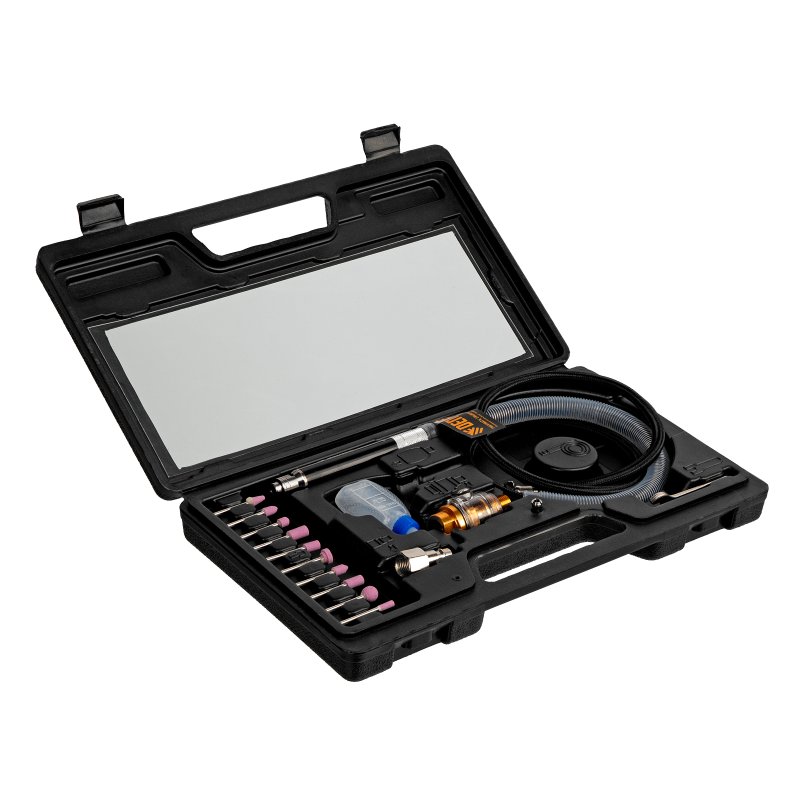 Пневматический гравер Denzel PE54000 57467 с цангой 3 мм подключается к компрессору, потребляет 57 л сжатого воздуха в минуту и обеспечивает скорость вращения оснастки 54000 об/мин. Предназначен для выполнения тонких работ: гравировки, шлифовки, зачистки. В комплект поставки входит 10 шлифовальных камней разной формы, что расширяет возможности применения инструмента. Гравер подходит для обработки металлических, каменных и других поверхностей, удобен для работы в ограниченном пространстве. Может использоваться в быту и на производстве.Преимущества    Регулировка скорости — можно с легкостью выбрать оптимальный режим работы в зависимости от поставленных задач.    Надежность — алюминиевый корпус устойчив к механическим повреждениям.    Удобное обслуживание — масленка входит в комплект поставки.    Долговечность — гравер поставляется с влагоотделителем, предотвращающим образование коррозии.    Защита от поломки — встроенный фильтр не пропускает загрязняющие частицы.    Комфортная работа без ощущения усталости — компактный инструмент весит 100 г.    Прочная упаковка — гравер поставляется в кейсе, удобном для хранения и транспортировки.    Гарантия 3 года — высокое качество инструмента подтверждено производителем.