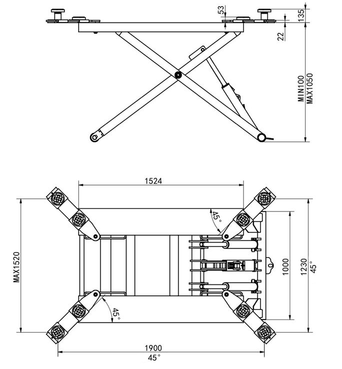 Благодаря параллелограммной форме и высоте подъема, телескопическим поворотным лапам, идеально подходит для использования в кузовных цехах и постах шиномонтажа