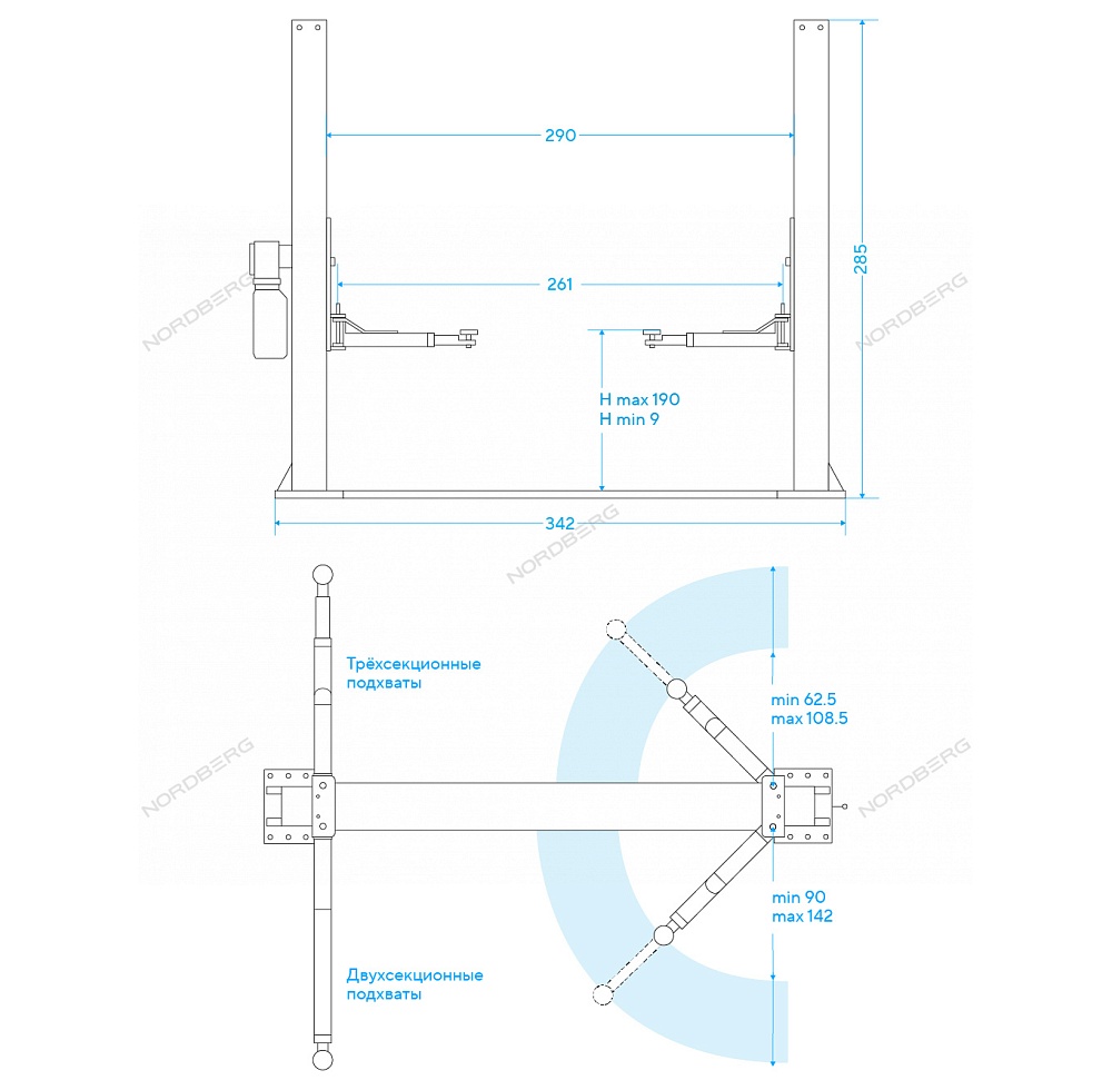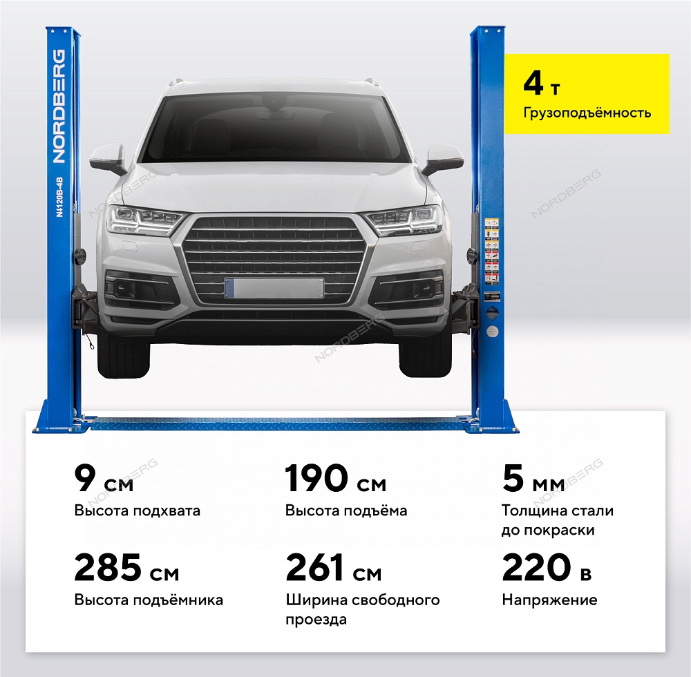 Подъемник двухстоечный 4 т, 380 В, синий NORDBERG N4120B-4B_3+2_380