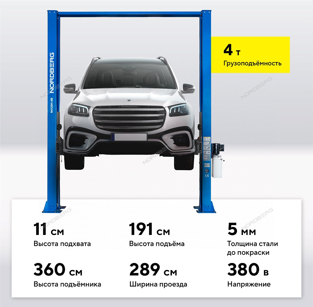 Подъемник двухстоечный 4 т, верхняя синхронизация, H=3,6 м, 220 В, синий NORDBERG N4120H-4B_3+2_220 купить в Тюмени цена ✅ - Все для СТО