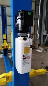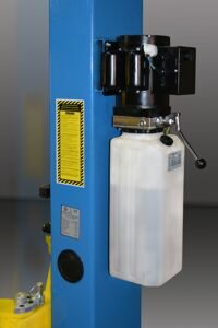 Двухстоечный электрогидравлический подъемник асимметричной конструкции с нижней синхронизацией. Снятие с замков безопасности ручное отдельно на каждой стойке.