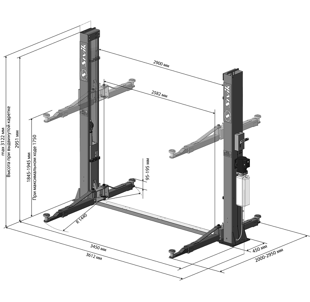 - Электрогидравлический двухстоечный подъемник с нижней связью для легковых автомобилей и внедорожников общей массой до 4,1 т.
