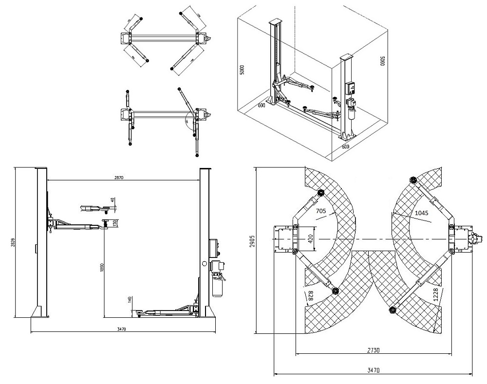 Двухконтурные гидроцилиндры прямого привода (разработаны и выполнены согласно стандартам ANSI компанией N.O.K, Япония). Электрогидравлическая силовая установка. Внутренние каретки с необслуживаемыми синтетическими ползунками. Регулируемые подъемные проставки. Верхний автоматический ограничитель подъема лап. Центральный пульт управления всеми операциями