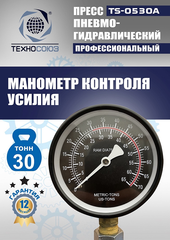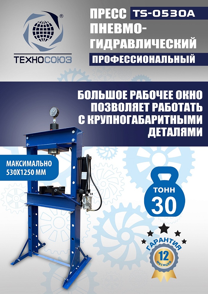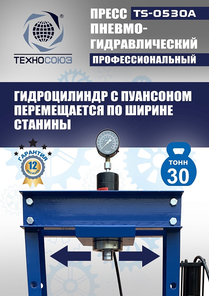 Пресс TS-0530A с усилием 30 тонн сочетает двухскоростной пневмогидравлический привод для быстрой выпрессовки неответственных деталей (втулок) в потоке работ и ручной режим для точного дозирования усилия на подшипниках. Управление ручное/пневматическое с манометром обеспечивает контроль, а гидроцилиндр перемещается по всей ширине рамы для удобства позиционирования.