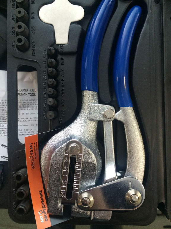 WDK-65015 Дырокол кузовной для металла, универсальный. Позволяет развить усилие в 1т и вырезать ровные отверстия различного диаметра в листовом металле толщиной до 2мм. Комплект насадок: 3/32″,1/8″,5/32″,3/16″,7/32″,1/4″,9/32″