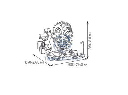 Для стальных и алюминиевых дисков 14-56”, колесо в сборе до 2300 х 1065мм, вес до 1500кг. Электромоторы: гидропомпы 1100Вт, редуктора 1300-1800Вт, в зависимости от комплектации.