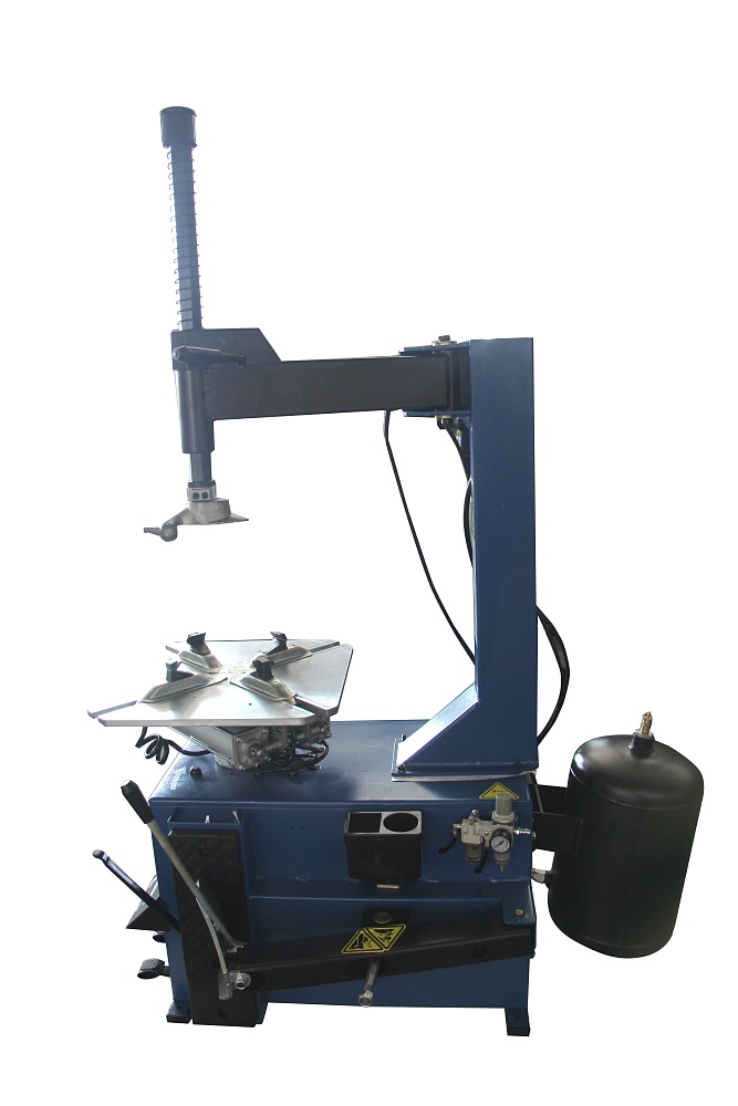Мощный профессиональный полуавтомат с дополнительным ресивером в монтажной стойке и устройством взрывной накачки бескамерных шин через отверстия в зажимных лапках для лучшей посадки бескамерной шины на колесный диск.