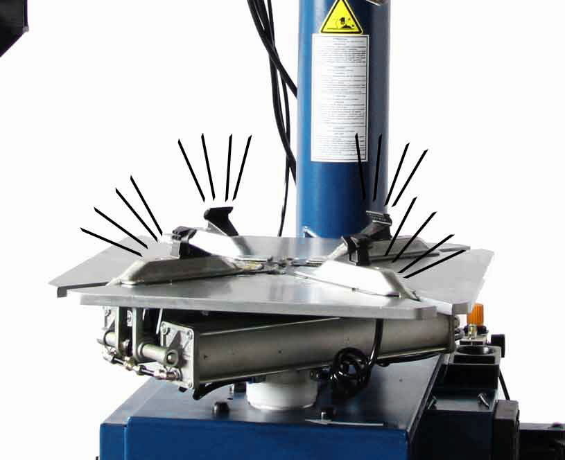Вспомогательная левая рука для прижима обода к столу в центральное отверстие и регулировки нажима на шину при монтаже оборудована пластиковыми насадками, позволяет бережно работать, не повреждая диск.  На правой руке предусмотрен ролик для закатки резины в диск при монтаже.
