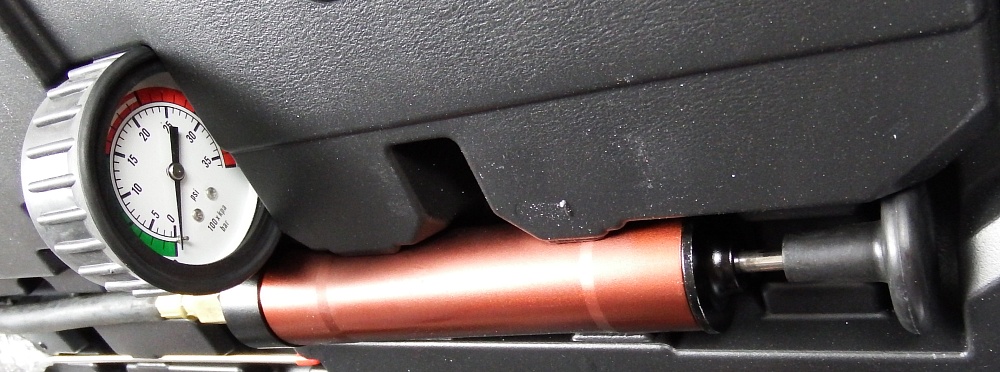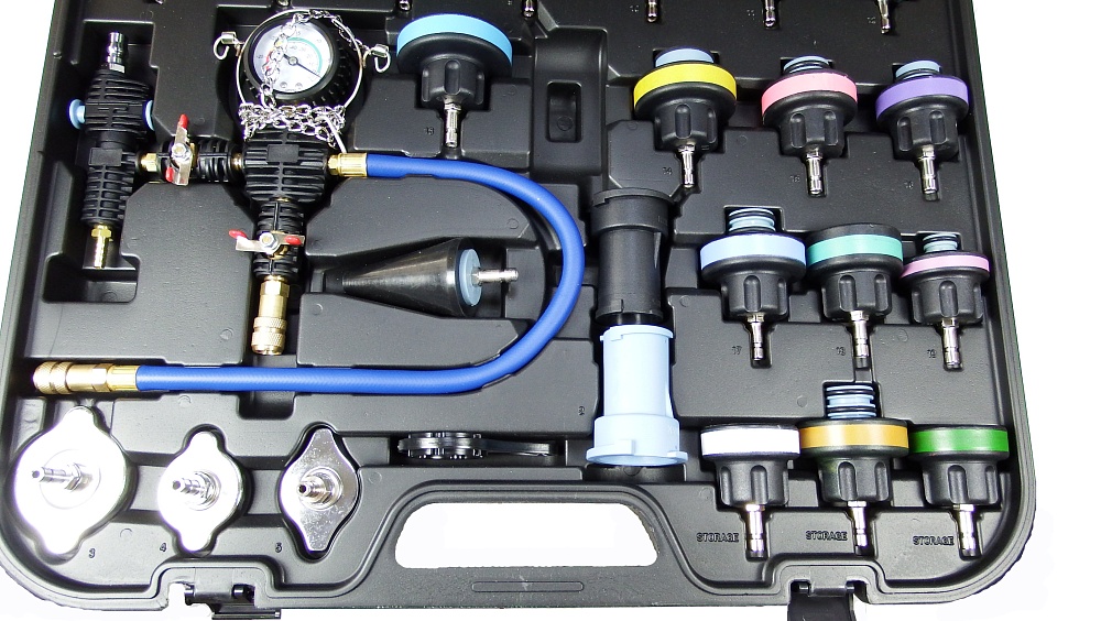 Используется для тестирования системы охлаждения на предмет утечек как самого радиатора, так и расширительного бачка. Тестирование можно осуществить двумя способами: с использованием ручного насоса или с помощью подключения сжатого воздуха через специальный адаптер со встроенным манометром и регулятором давления (давление не более 1 бар).