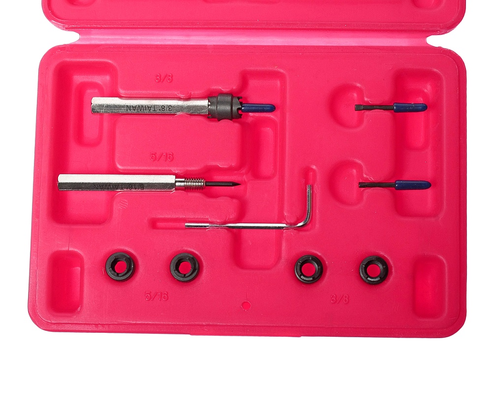 Набор инструментов для высверливания сварочных точек (9 предметов) кейс JTC 3321 включает в себя сверла 3/8" и 5/16", коронки 3/8" и 5/16", хвостовики 1/4", направляющие штифты и ключ-шестигранник. Материалом инструмента служит сталь. Сфера применения - сверление точек сварки в кузовных панелях, дверях и крыльях автомобилей.