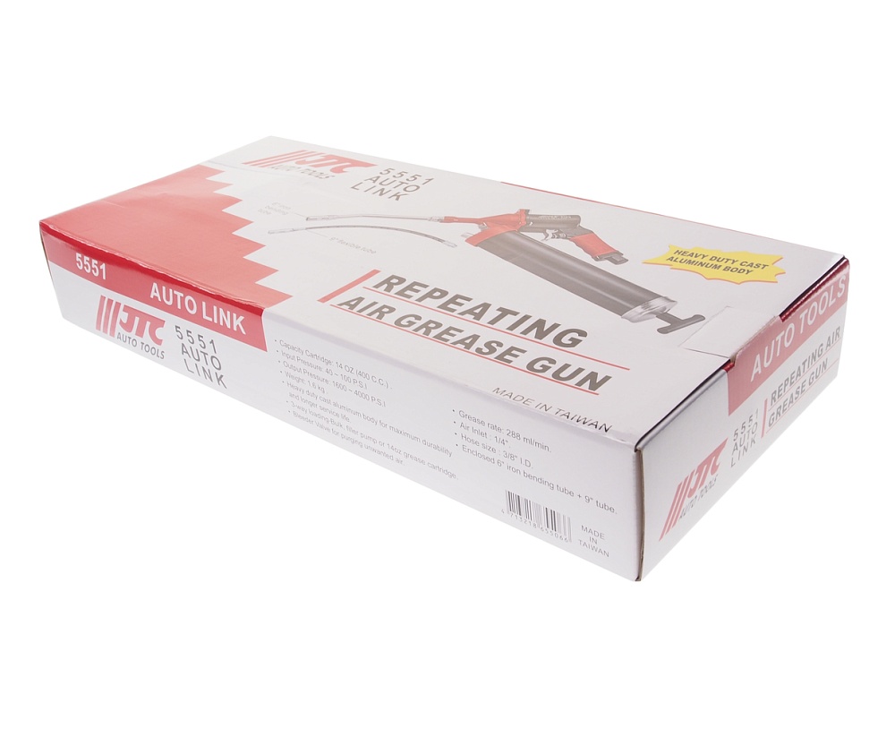 Шприц смазочный автоматический 400куб.см JTC. Высокопрочный литой алюминиевый корпус обладает достаточной прочностью. Имеет долгий срок эксплуатации. 3 способа наполнения смазкой: зарядный бак, подающий насос или картридж со смазкой на 14 унций (400 куб.см.). Клапан стравливания для сброса нежелательного воздуха. Скорость подачи смазки: 288 мл/мин.<br>