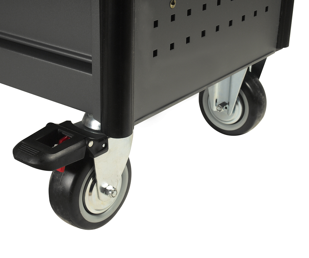 • Корпус тележки оснащен защитными бортами, что сводит к минимуму риск повреждения оборудования и нанесение травм автомеханикам во время перемещения по СТО.