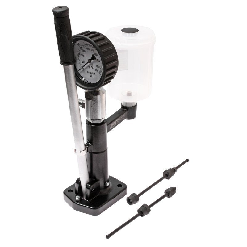 Стенд для проверки дизельных форсунок с калибровочным ручным насосом JTC-4818. В комплекте манометр, бачок для жидкости и соединительные трубки с адаптерами.