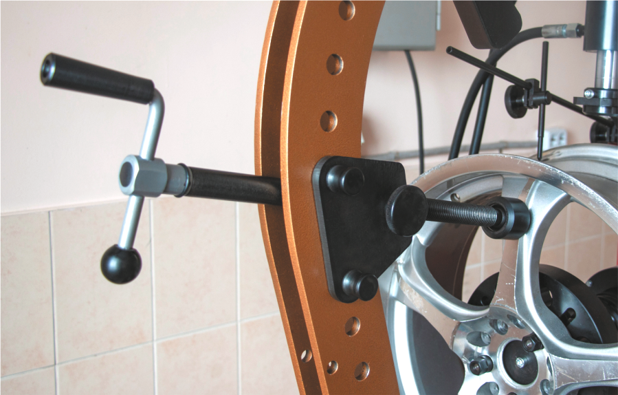 Обновленный стенд получил специальную конструкцию – мост с навесным оборудованием, устанавливаемый на место классических упоров. При этом на мост устанавливаются свои, специальные упоры, полностью замещающие старые и расширяющие возможности ремонта колесных дисков. Также на мост установлен винтовой упор, необходимый для правки сложных повреждений и повреждений типа «восьмерка», и специальный двухсторонний гидроцилиндр с захватом. Конструкция гидроцилиндра позволяет фиксировать его в любом положении и производить правку диска одной рукой, без удержания гидроцилиндра на весу.