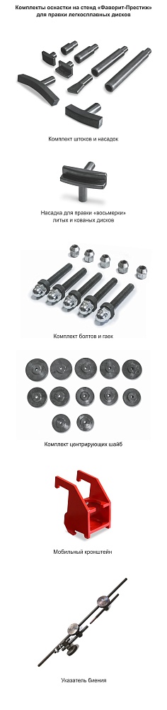 Стенд для правки дисков «Фаворит-Престиж» предназначен для правки особо сложных повреждений литых и кованых легкосплавных дисков, а также для правки «восьмерки» и спиц дисков от 10 до 26 дюймов включительно (от 22-х дюймов используйте мобильный кронштейн). Рама изготовлена с допустимыми нагрузками до 12 тонн. Вал изготовлен из высоколегированной конструкционной стали с повышенной износостойкостью и прочностью. Стенд оснащен запатентованными специальными болтами для крепления дисков и усиленной планшайбой. Также стенд оборудован электрическим приводом вращения вала, предназначенного для облегчения поиска зоны правки диска, что, безусловно, повышает производительность труда и качество работ.