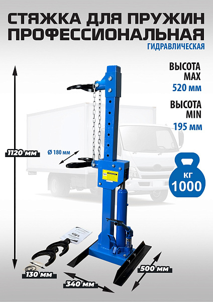 Профессиональная. Напольная с ножным приводом и защитным металлическим экраном. Облегчает монтаж / демонтаж особо прочных пружин со стойки. Для работы со стойками легковых автомобилей, джипов, микроавтобусов и коммерческого автотранспорта. Конструкция изделия сварная с использованием легированной стали. Гидравлическая с усилием 1000 кг. Ход поршня 325 мм. Диаметр пружины 101 - 165 мм.  Рабочая длина min-max 195-520 мм.