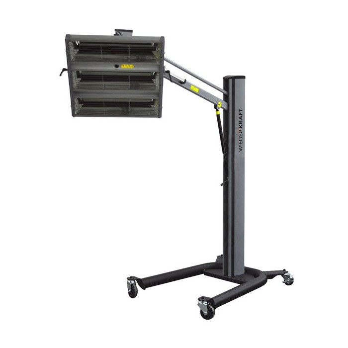 Мобильная трехкассетная ИК сушка WDK-3CH   профессиональное мобильное устройство для сушки лакокрасочных покрытий ИК излучением. Блок, объединяющий три кассеты, с коротковолновыми ИК лампами размещен на пантографической стойке. Кассетный блок легко поднимается на высоту 2300мм. Стойка прибора оборудована газовым амортизатором,  для поддержки и изменения положения кассетного блока. Регулировка положения блока кассет осуществляется крепёжными винтами с удобной ручкой. «П» — образная опорная платформа имеет 4 колёсика (2 из которых оснащены стопором), что обеспечивает устойчивость и позволяет располагать сушку в любом необходимом месте, для работы с кузовом автомобиля. Панель управления проста и понятна в настройках и обеспечивает возможность регулирования мощности и времени нагрева. Модель оснащена ультразвуковым датчиком контроля расстояния.