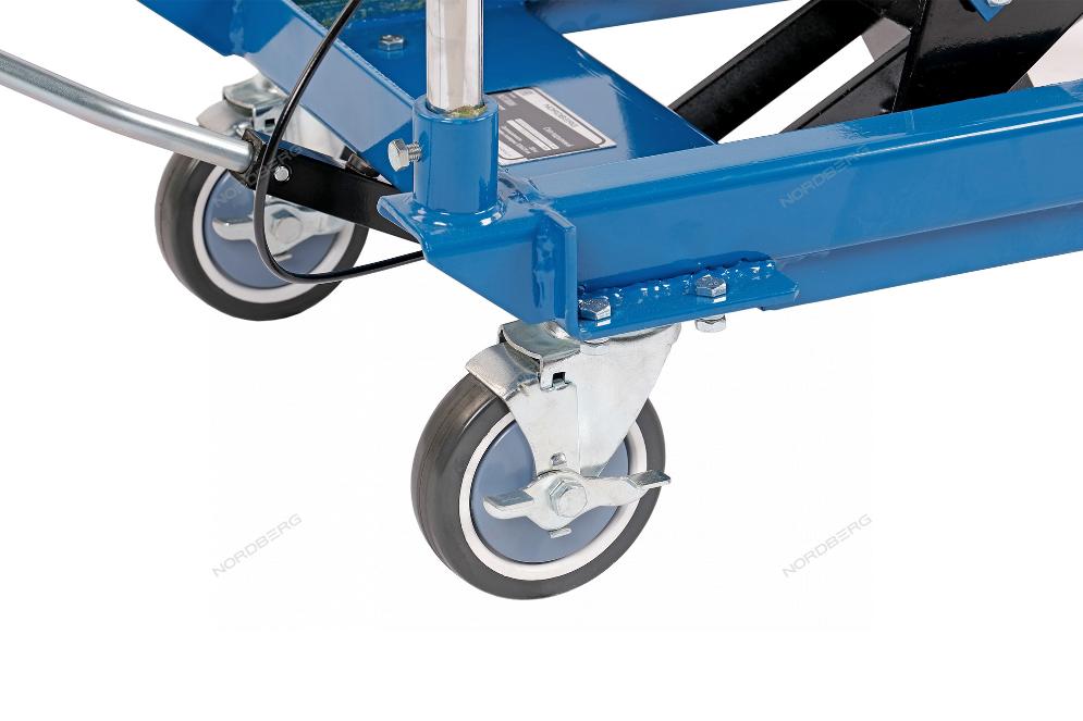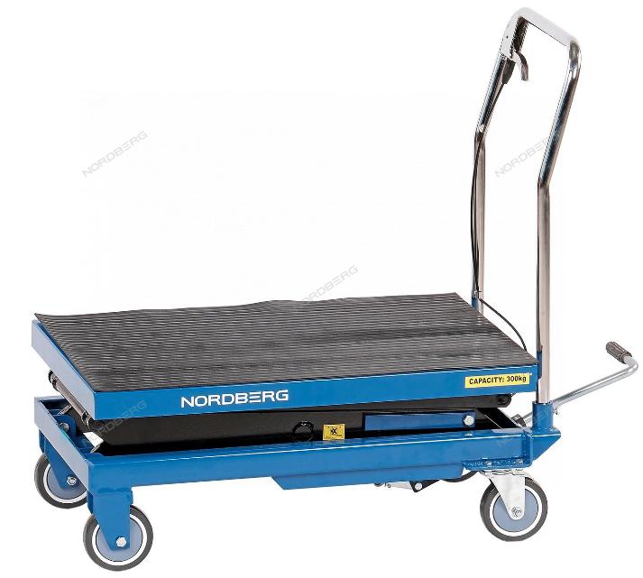 Подъемный гидравлический стол  NORDBERG N3T301 предназначен для подъема, опускания и перемещения груза. Конструкция представляет собой совмещение платформенной тележки и стационарного подъемного стола. Подъемный стол имеет гидравлический ножной привод, который позволяет произвести быстрый подъем груза. Опускание производится путем нажатия рычага на ручке подъемного стола. Гидравлическая система позволяет столу опускаться плавно, обеспечивая безопасность работ с грузами. Стол позволяет не только приподнимать грузы, но и перемещать их на расстояния.