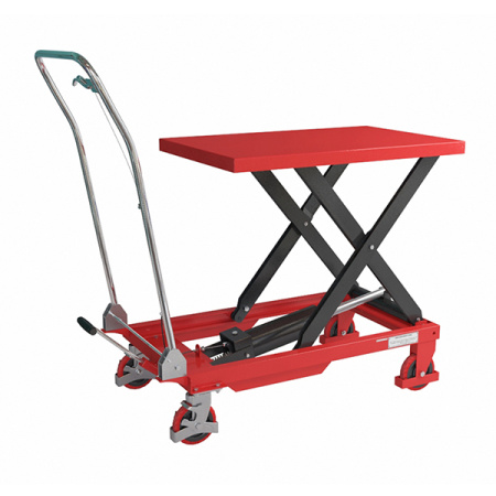 Для удобства перемещения тележка оснащена ручкой. Для подъема и опускания платформы тележка оснащена приводимым в движение ногой гидравлическим приводом, который обеспечивает плавное опускание платформы с грузом. Тележка имеет стояночный тормоз (ножной).