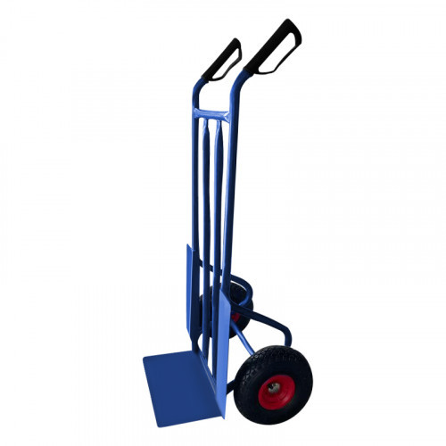 Пневматические колеса диаметром 250 мм способствуют легкому перемещению даже по неровным поверхностям. Для удобства управления и надежности хвата рук ручки тележки прорезинены и имеют дополнительную защиту от травм. Перевозимый груз защищен от колес дополнительными пластинами. Платформа тележки изготовлена из толстой листовой стали и имеет размер 200x350 мм. Для удобства погрузки на задней стороне рамы расположены дополнительные упоры. Металлические элементы ручной тележки защищены от влаги, коррозии и солнечных лучей износостойкой краской.
